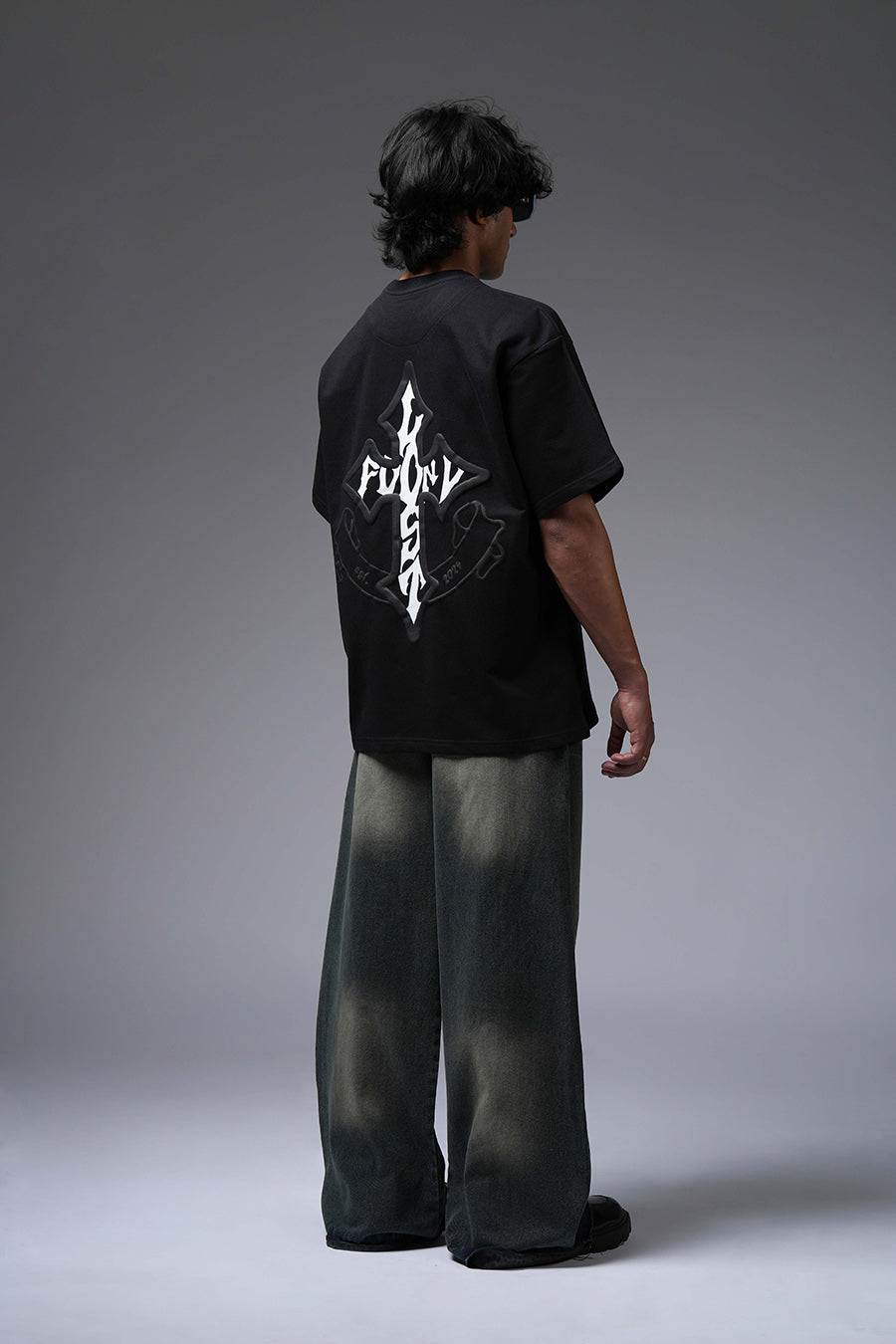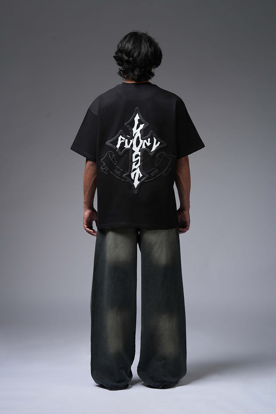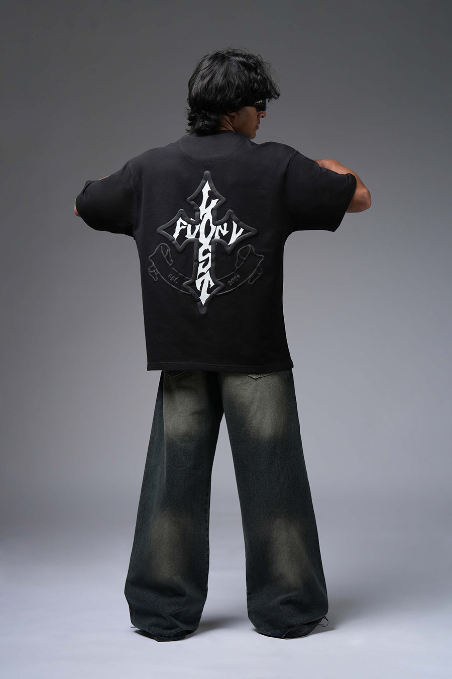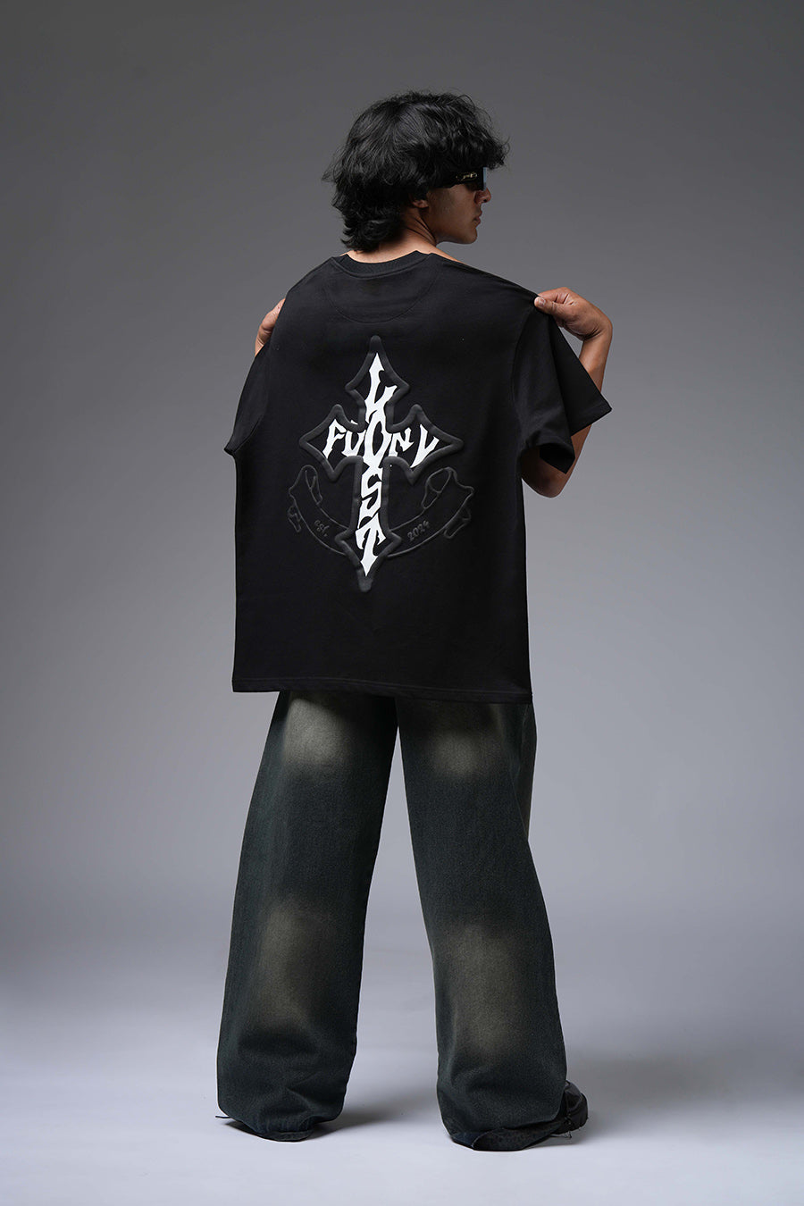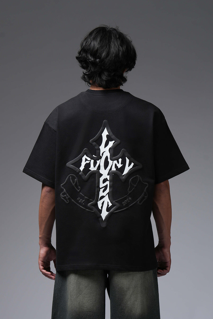 The Anchor of the Lost Tee features a striking, gothic cross design, rendered in white against a deep black backdrop, suggesting a symbol of hope or guidance in times of uncertainty. The word "Lost" and "Found" integrated into the cross adds an enigmatic, almost cryptic element. This tee evokes a sense of finding stability and direction in a chaotic world. The oversized fit enhances the dramatic, statement-making aesthetic. It's a wearable emblem of resilience and finding one's footing.