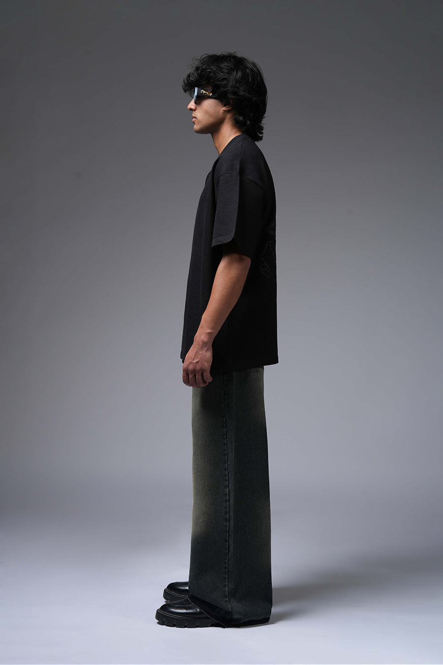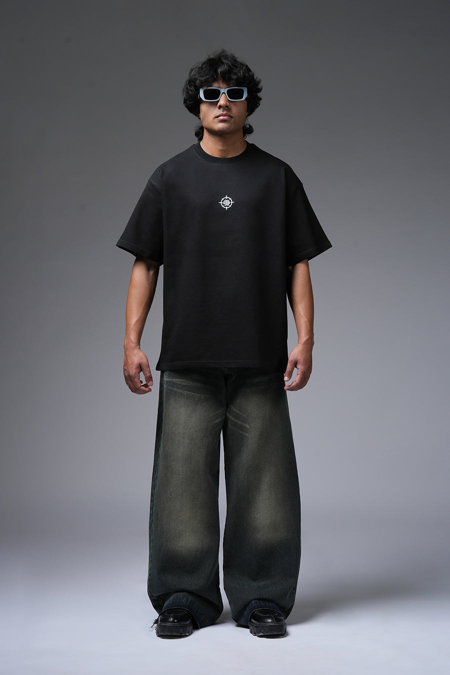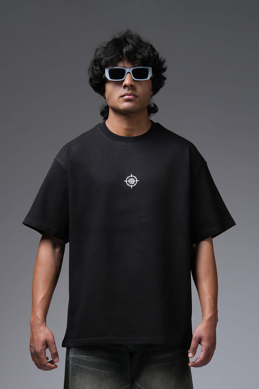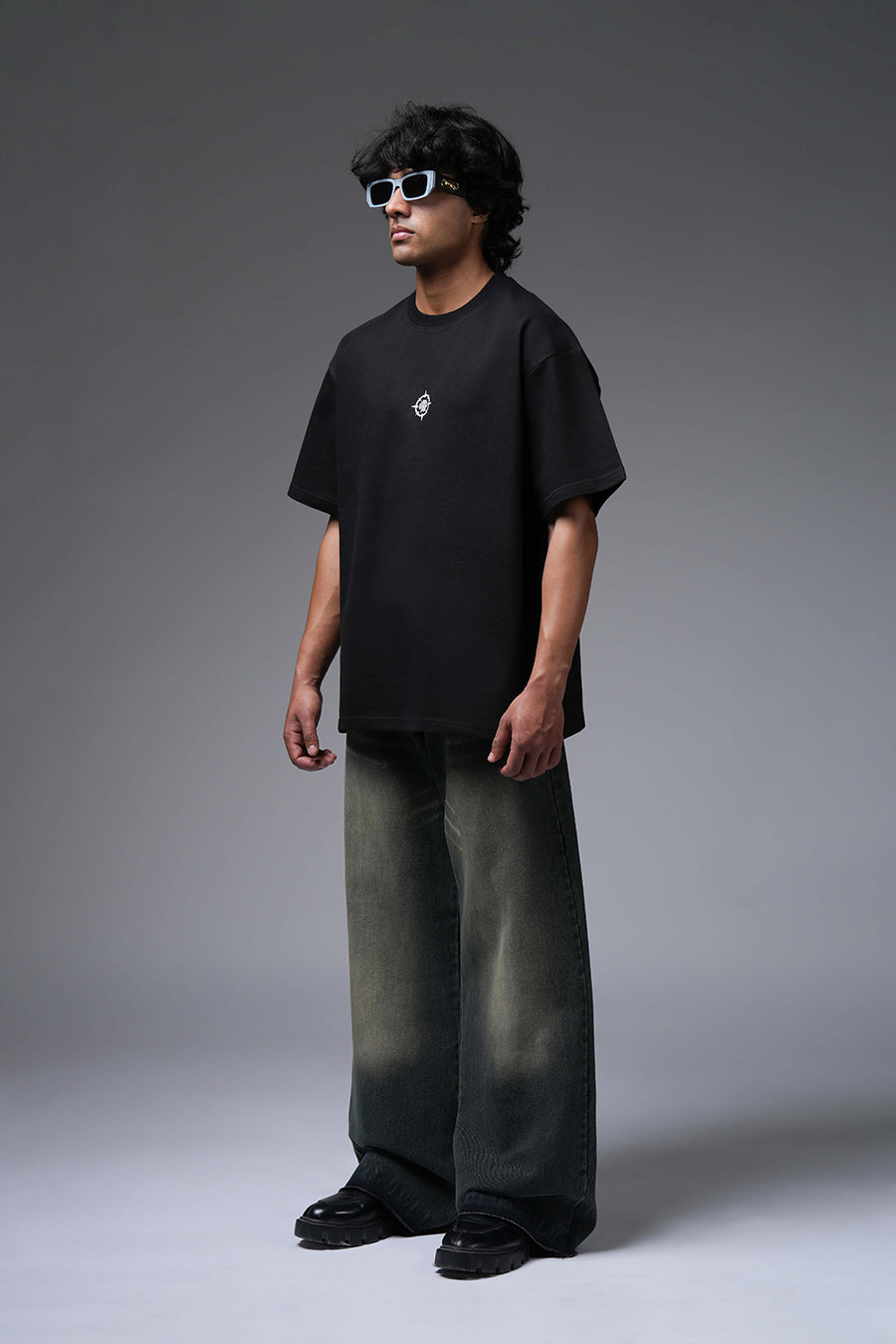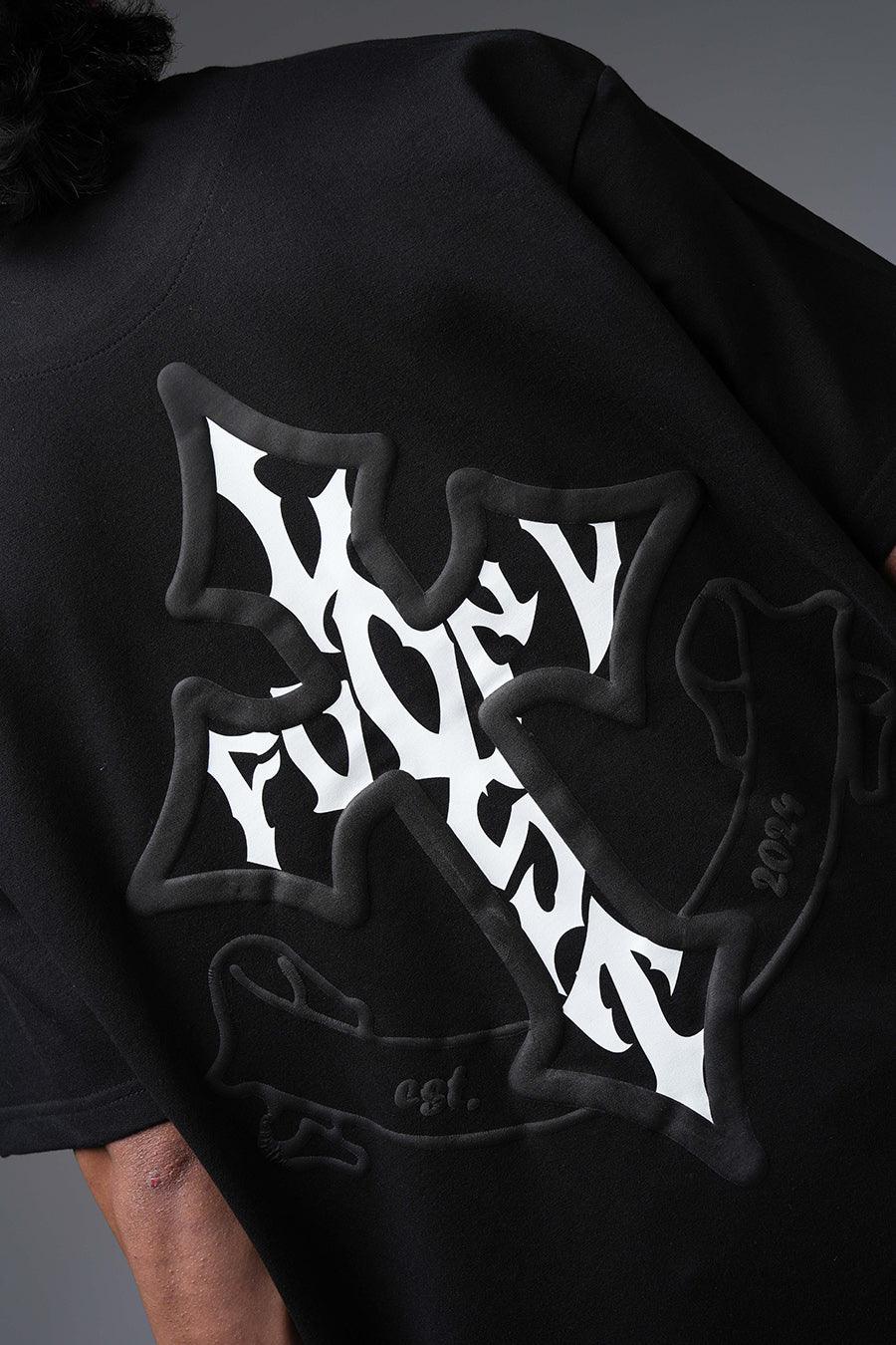 The Anchor of the Lost Tee features a striking, gothic cross design, rendered in white against a deep black backdrop, suggesting a symbol of hope or guidance in times of uncertainty. The word "Lost" and "Found" integrated into the cross adds an enigmatic, almost cryptic element. This tee evokes a sense of finding stability and direction in a chaotic world. The oversized fit enhances the dramatic, statement-making aesthetic. It's a wearable emblem of resilience and finding one's footing.