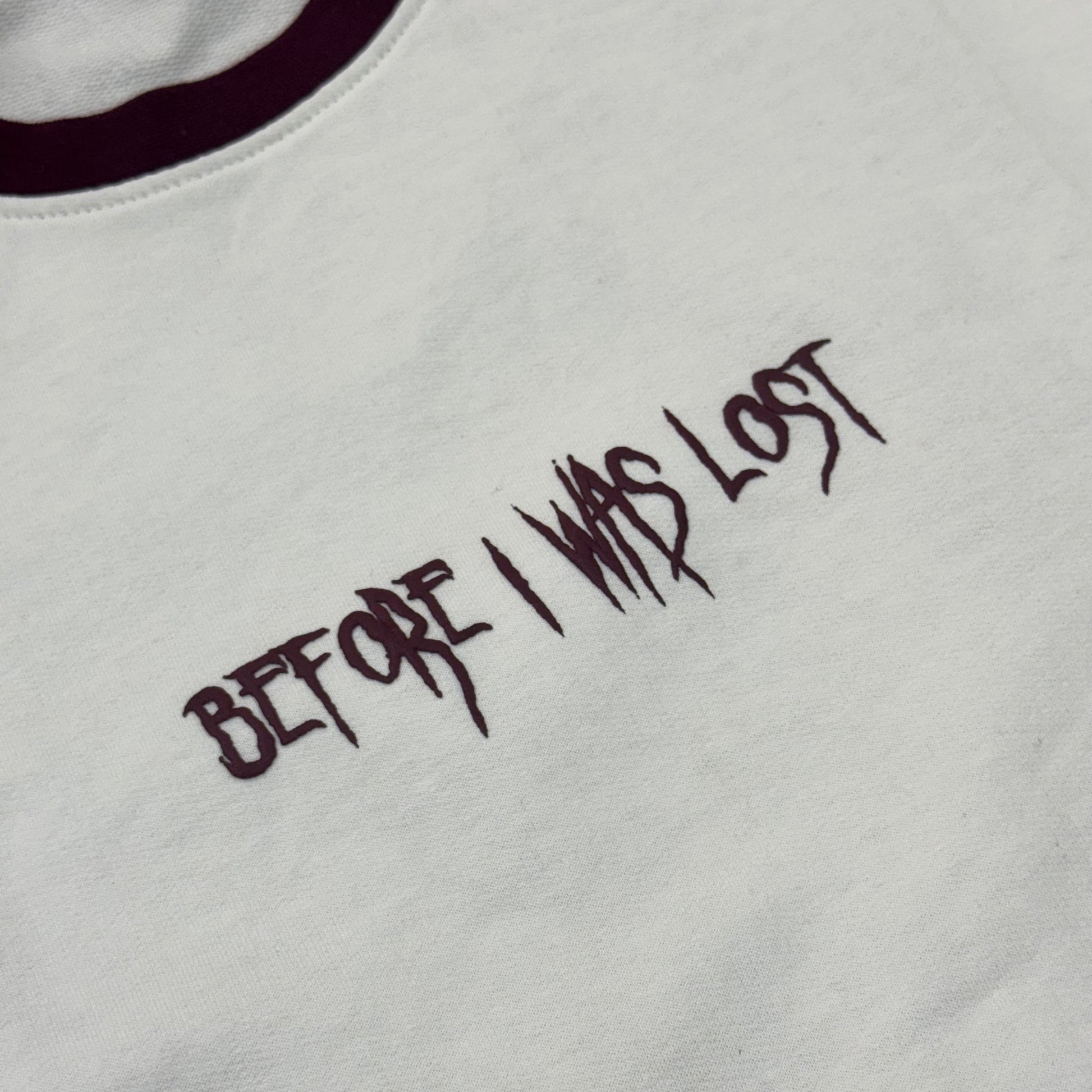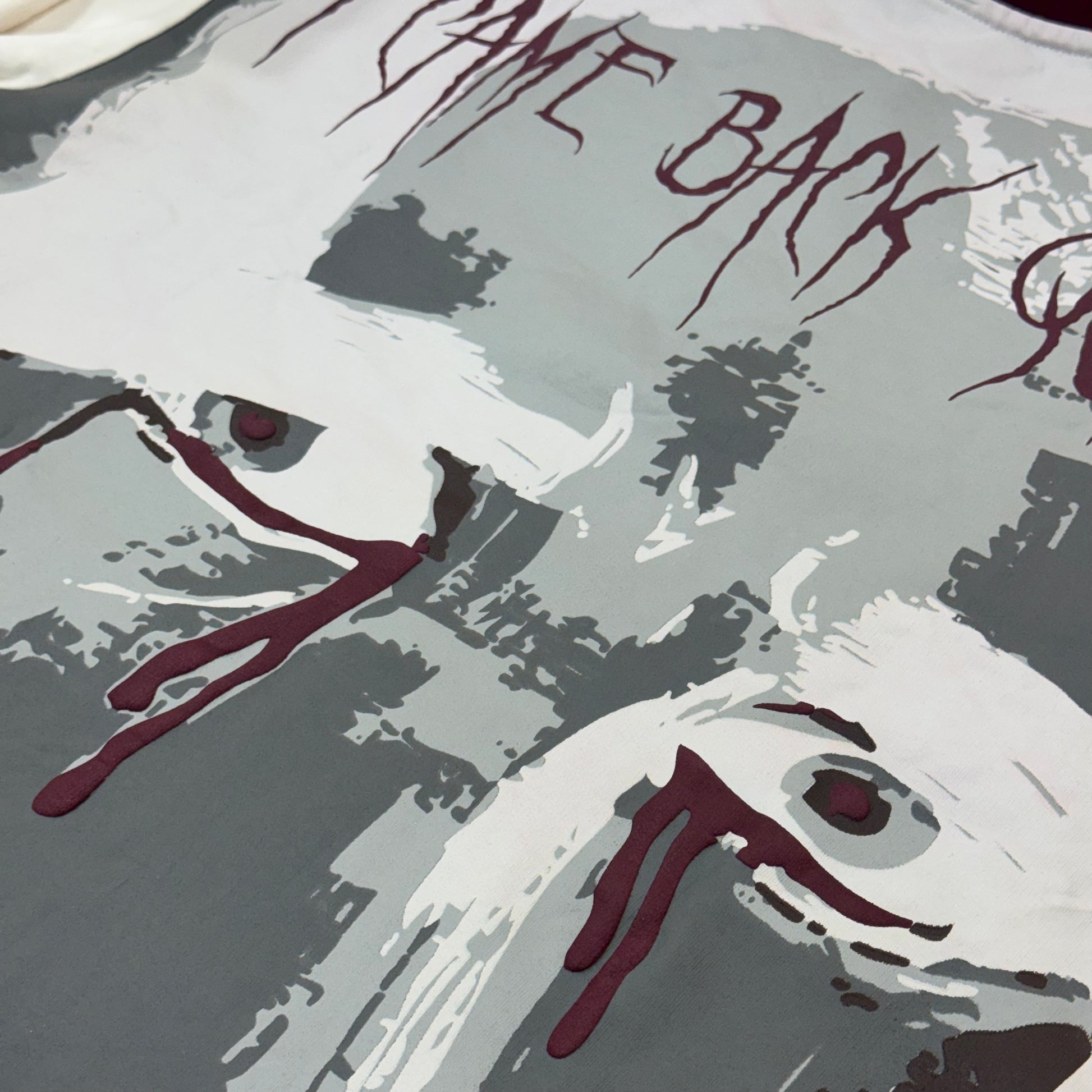 On the front, the words “Before I Was Lost” sit understated across the chest, while the back reveals a haunting visage washed in greys and deep crimson — eyes half-open, half-remembering. The phrase “I Came Back Quiet” fades across the top, like a whisper from the past.