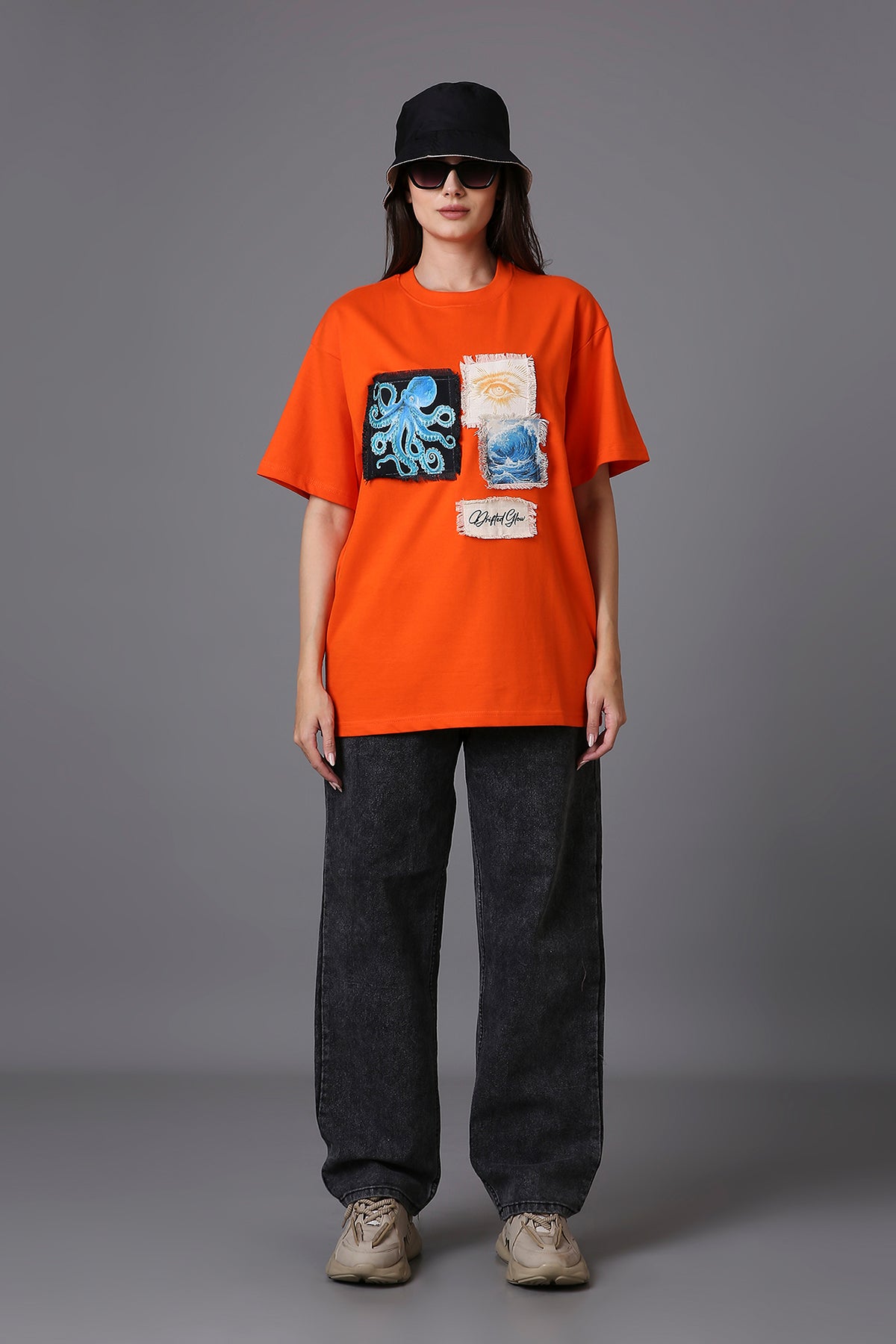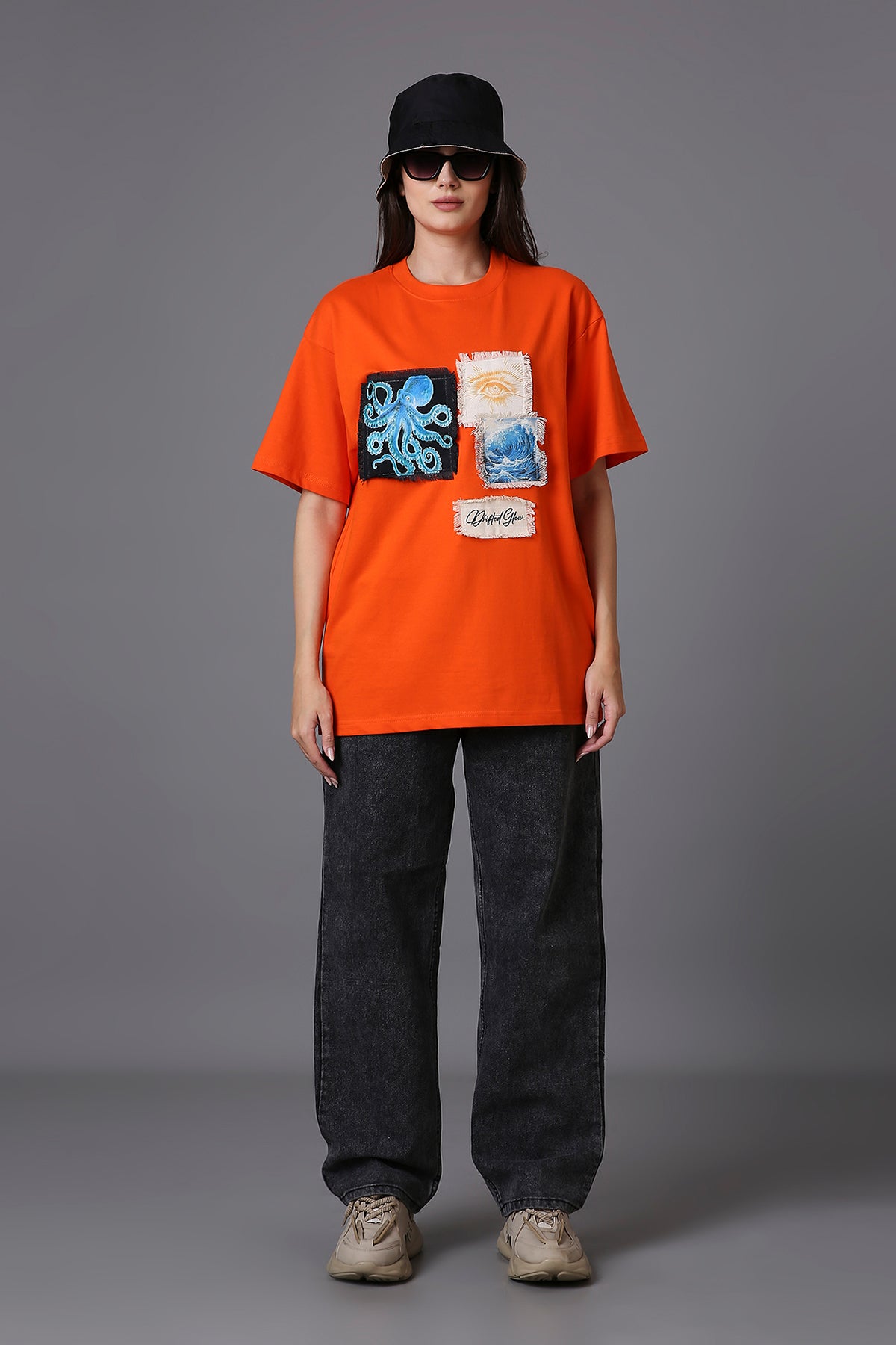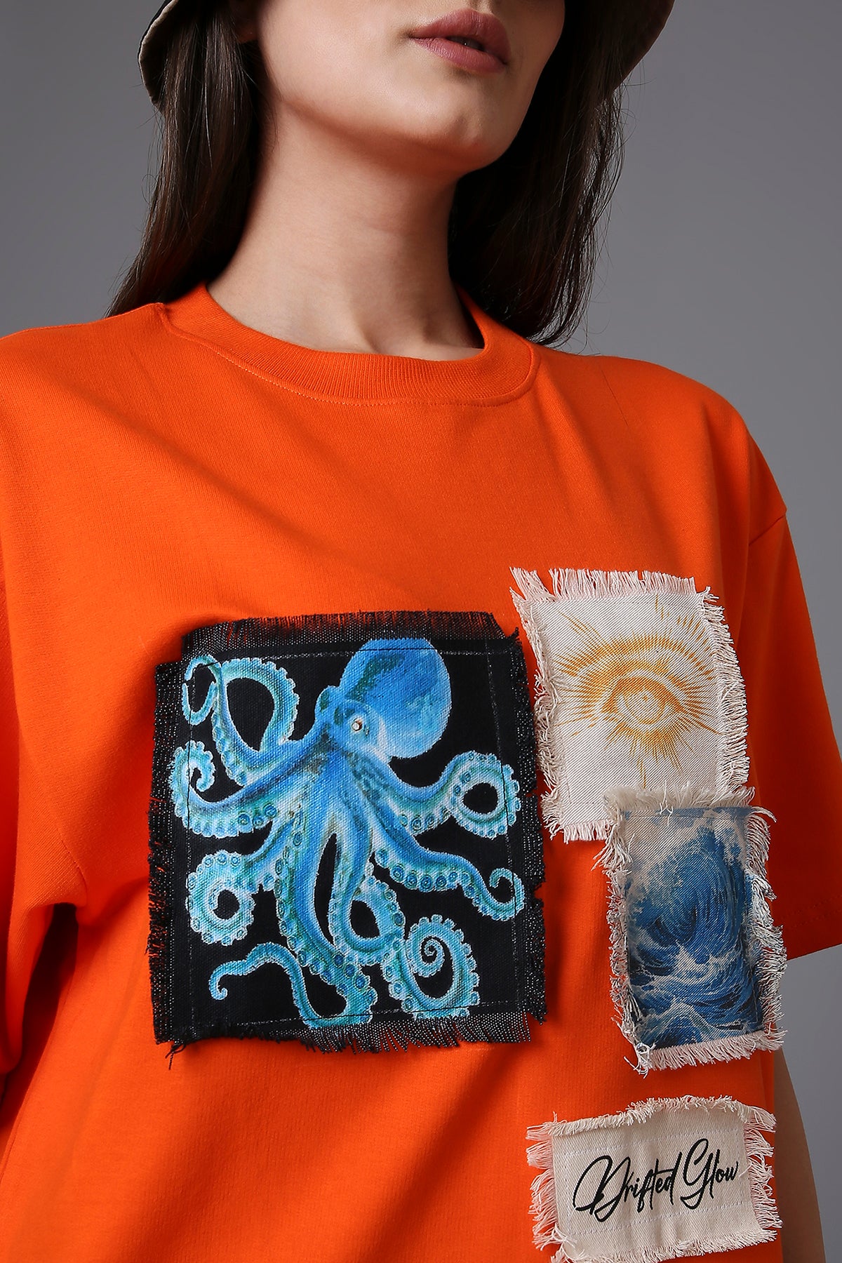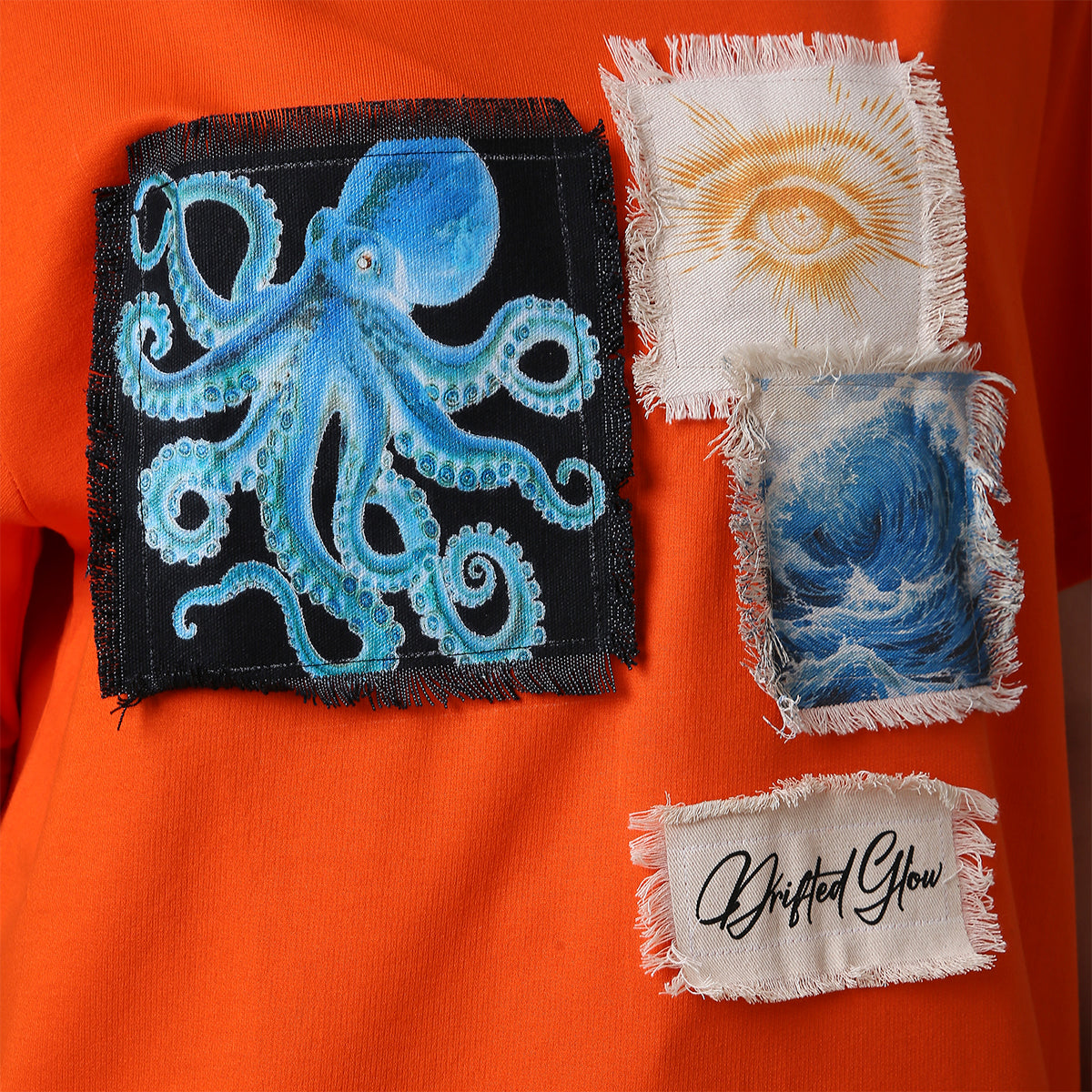 The Drifted Glow Tee captures a vibrant, eclectic aesthetic. A bright orange canvas is adorned with patch-like squares featuring diverse imagery: an octopus, a wave, and script, suggesting a collection of found memories or travel tokens. The back reveals a blue jellyfish, adding an element of the deep sea. This tee evokes a sense of journey and discovery, pieced together from disparate elements. Its bold colour and varied graphics create a unique, statement-making piece.