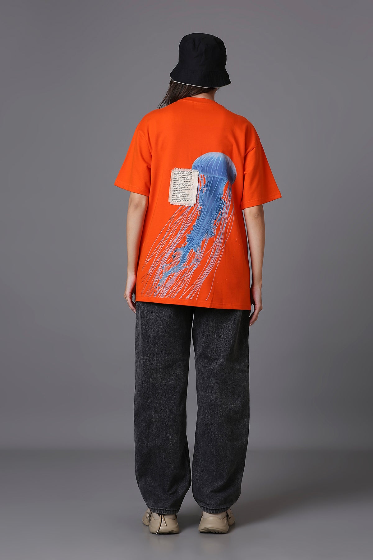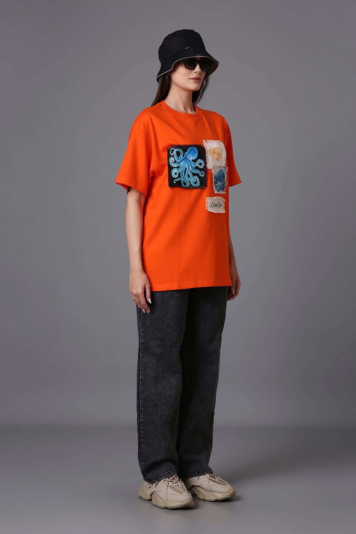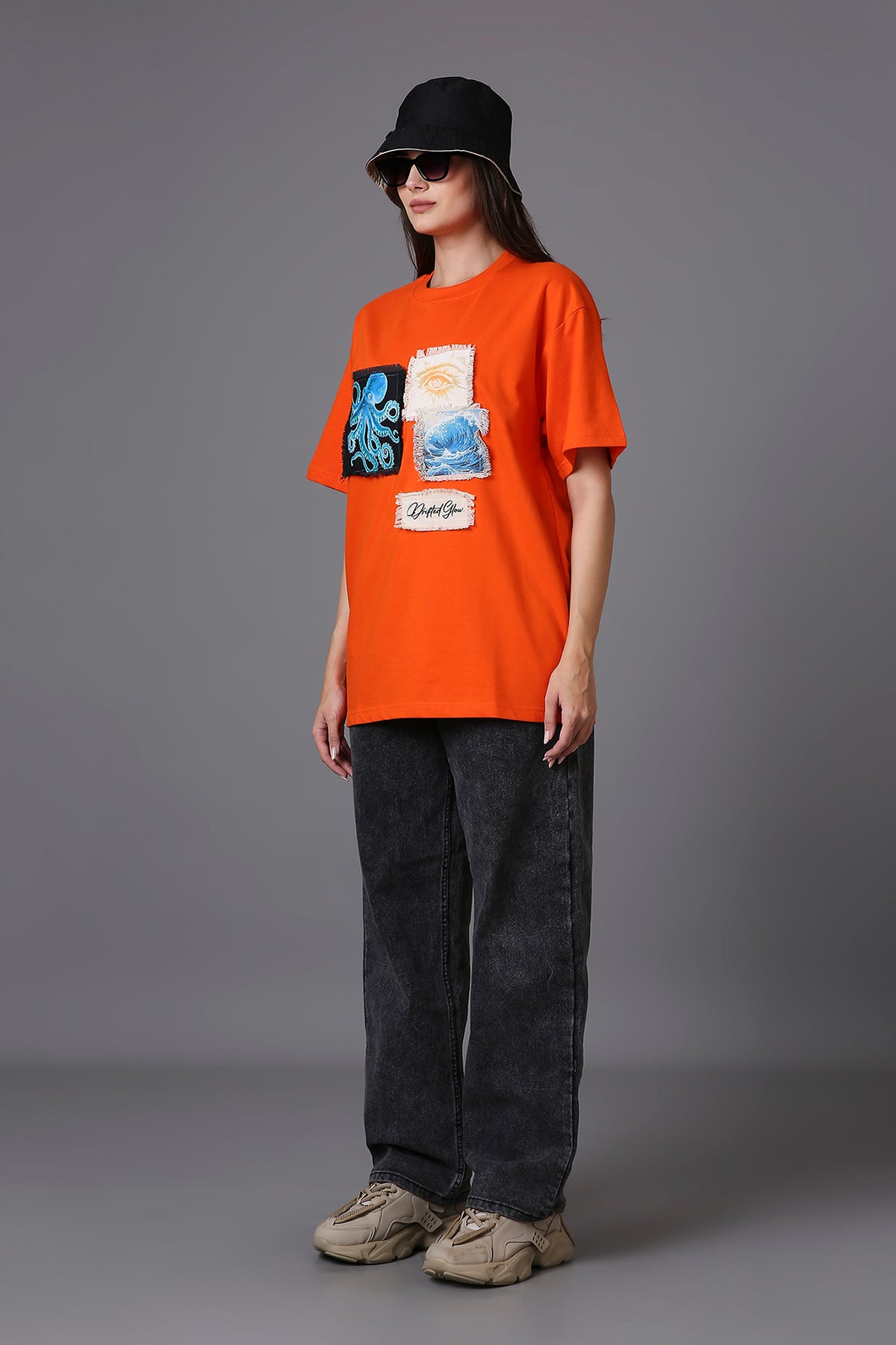 The Drifted Glow Tee captures a vibrant, eclectic aesthetic. A bright orange canvas is adorned with patch-like squares featuring diverse imagery: an octopus, a wave, and script, suggesting a collection of found memories or travel tokens. The back reveals a blue jellyfish, adding an element of the deep sea. This tee evokes a sense of journey and discovery, pieced together from disparate elements. Its bold colour and varied graphics create a unique, statement-making piece.