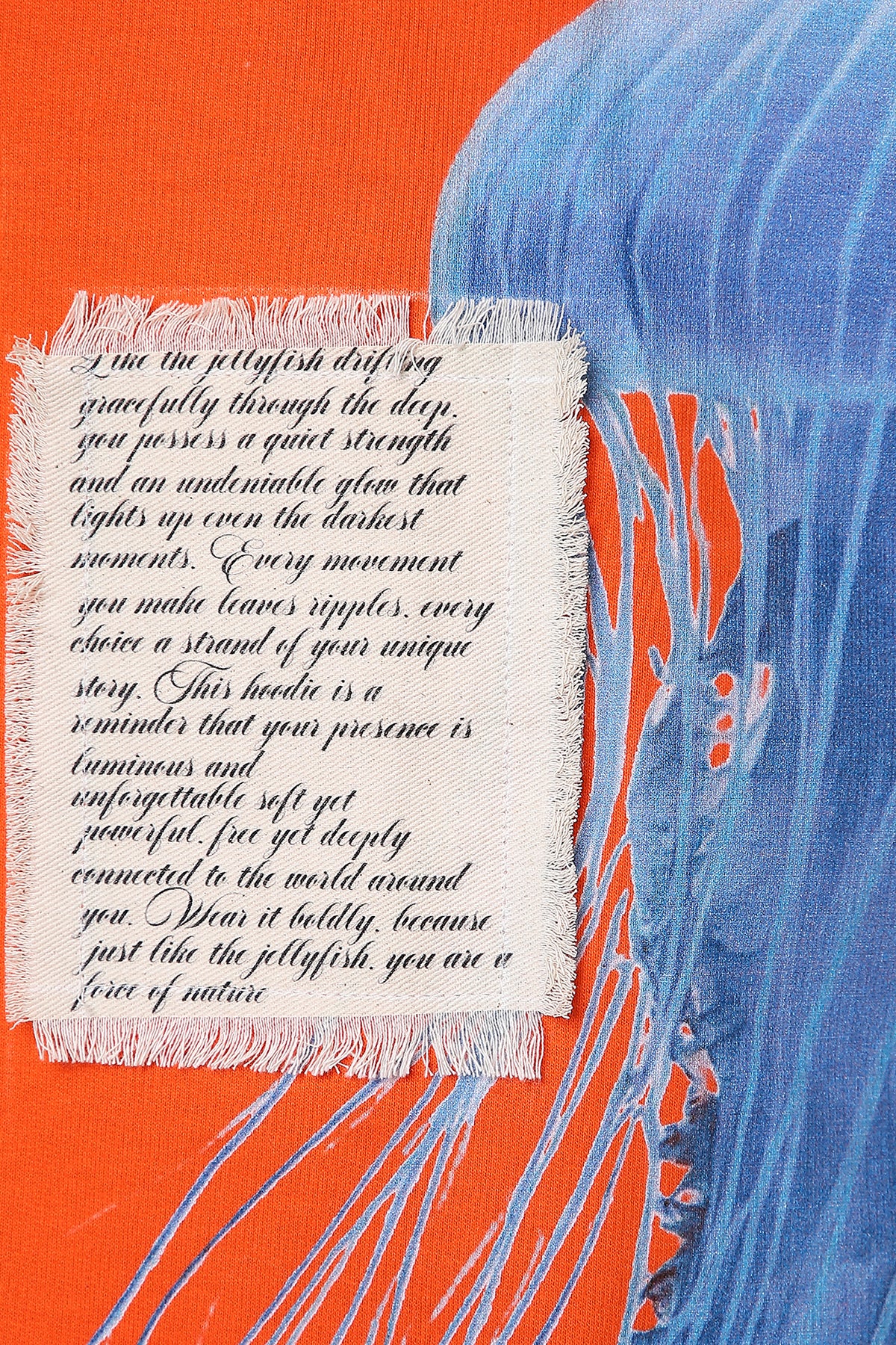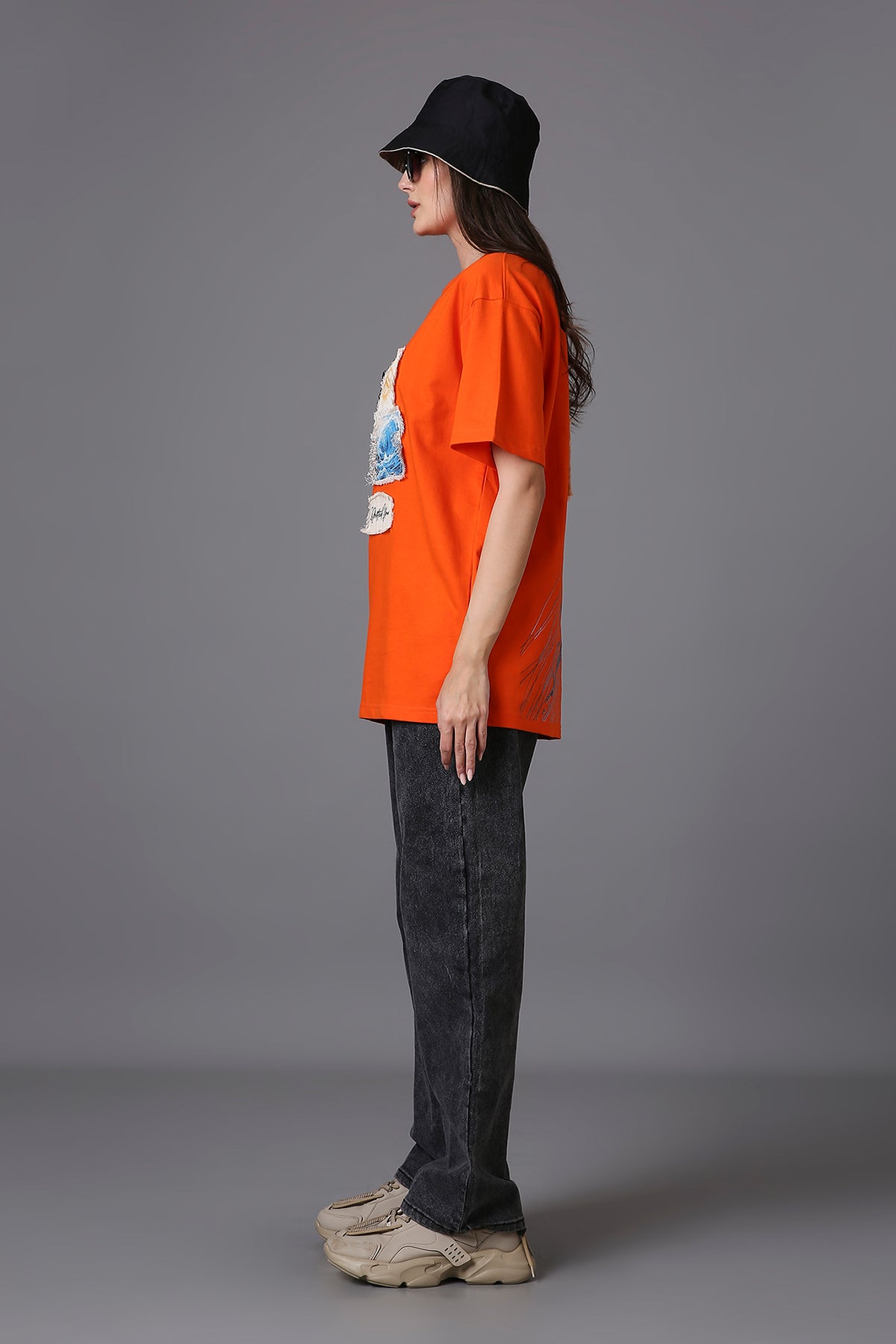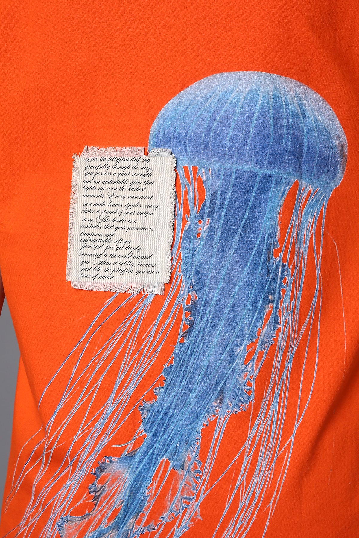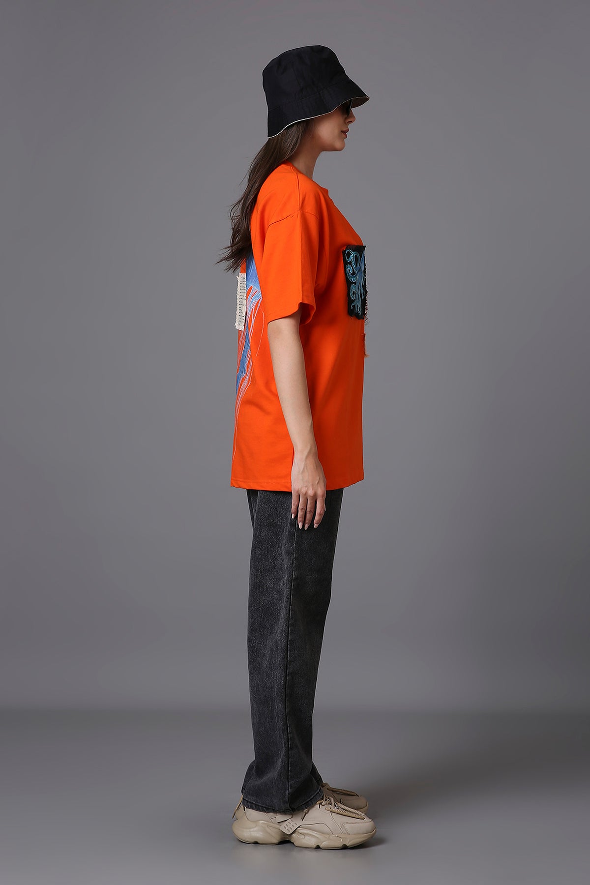 The Drifted Glow Tee captures a vibrant, eclectic aesthetic. A bright orange canvas is adorned with patch-like squares featuring diverse imagery: an octopus, a wave, and script, suggesting a collection of found memories or travel tokens. The back reveals a blue jellyfish, adding an element of the deep sea. This tee evokes a sense of journey and discovery, pieced together from disparate elements. Its bold colour and varied graphics create a unique, statement-making piece.