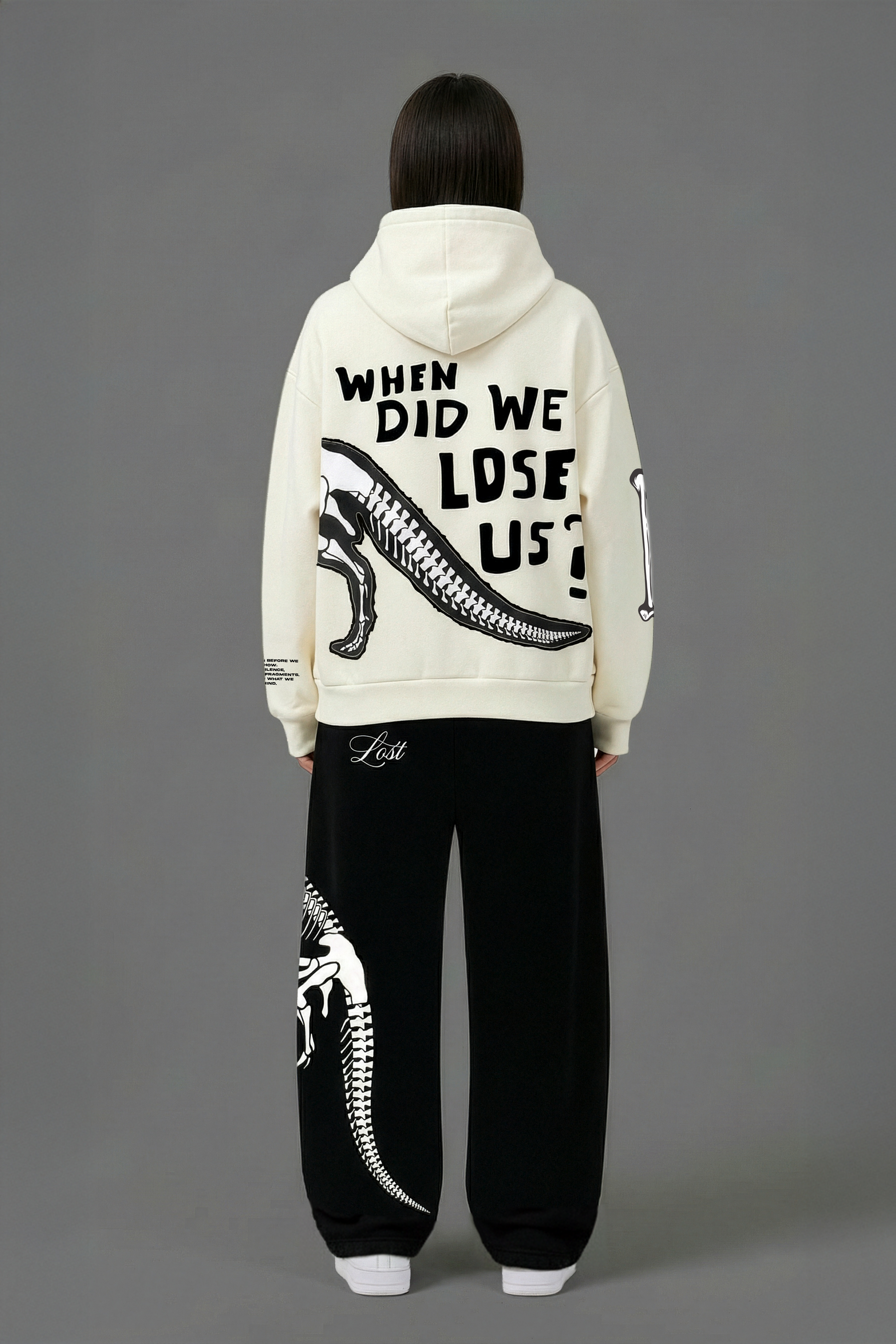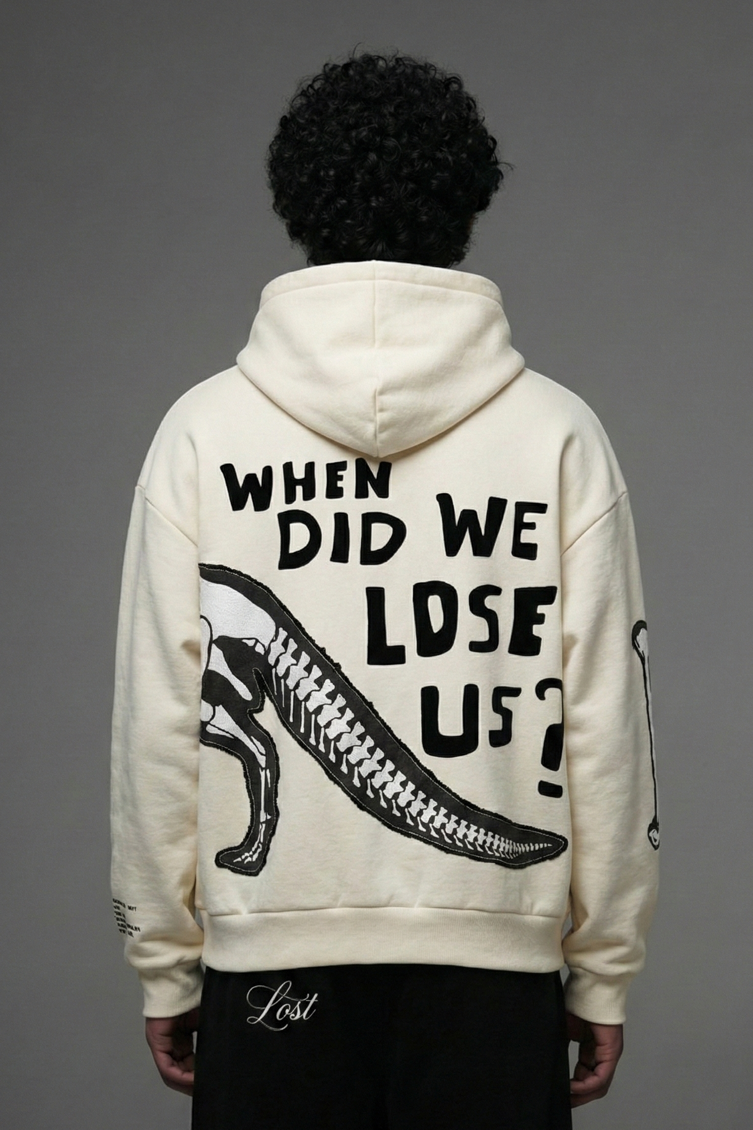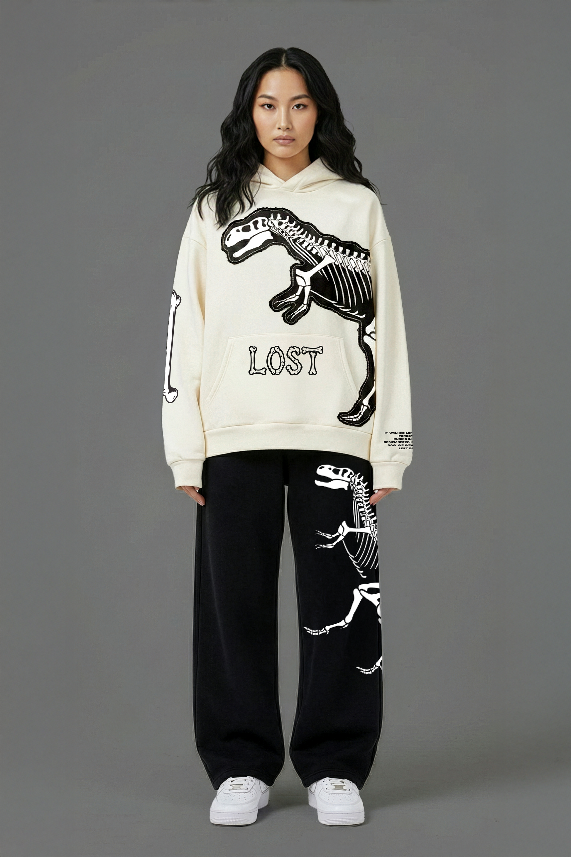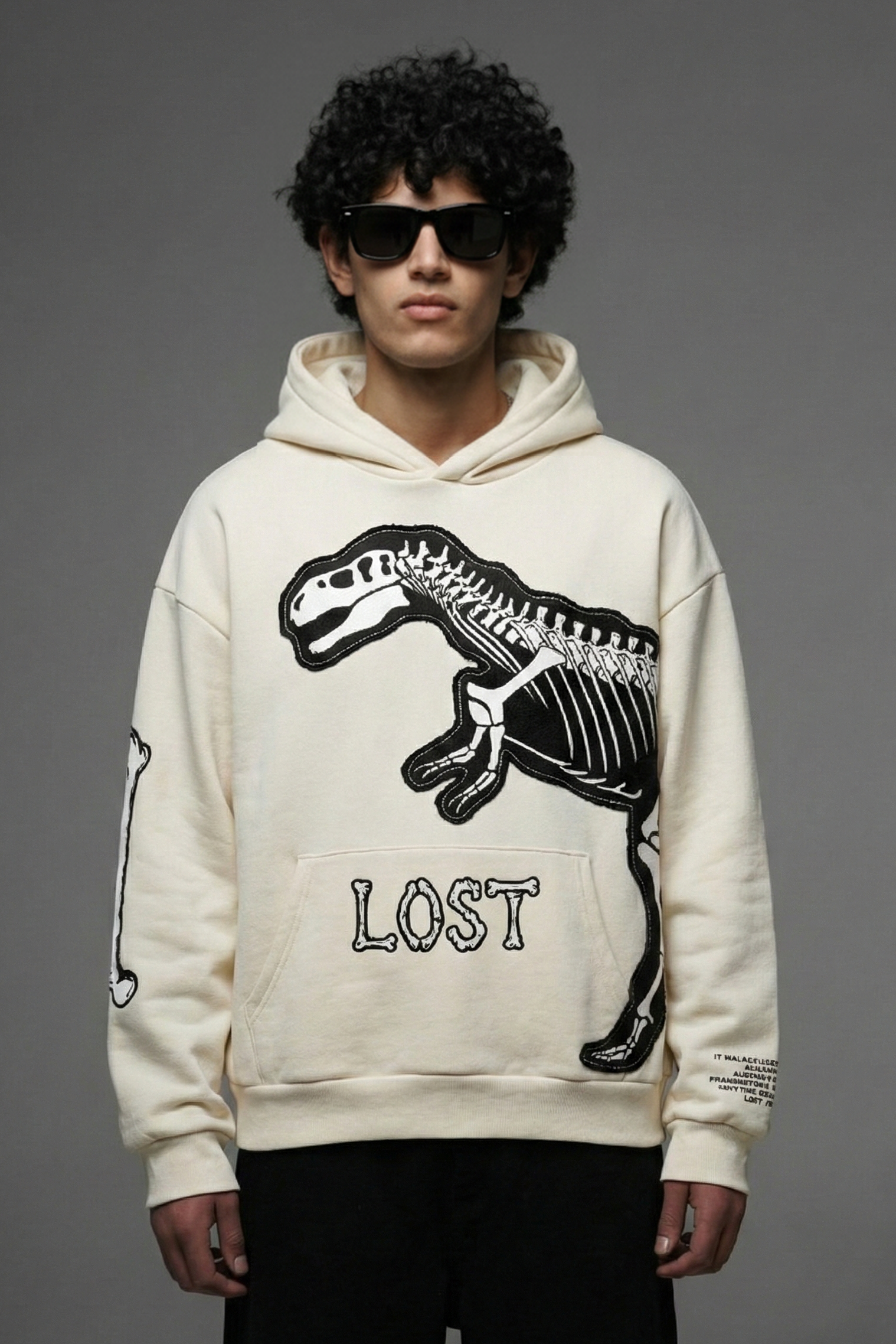 Heavyweight beige hoodie featuring a dinosaur graphic printed on black canvas and precision-stitched onto the body for depth, texture, and durability. Crafted from thick 400 GSM fleece that feels warm, structured, and premium without losing comfort. Loose, relaxed fit built for daily wear and effortless layering.
