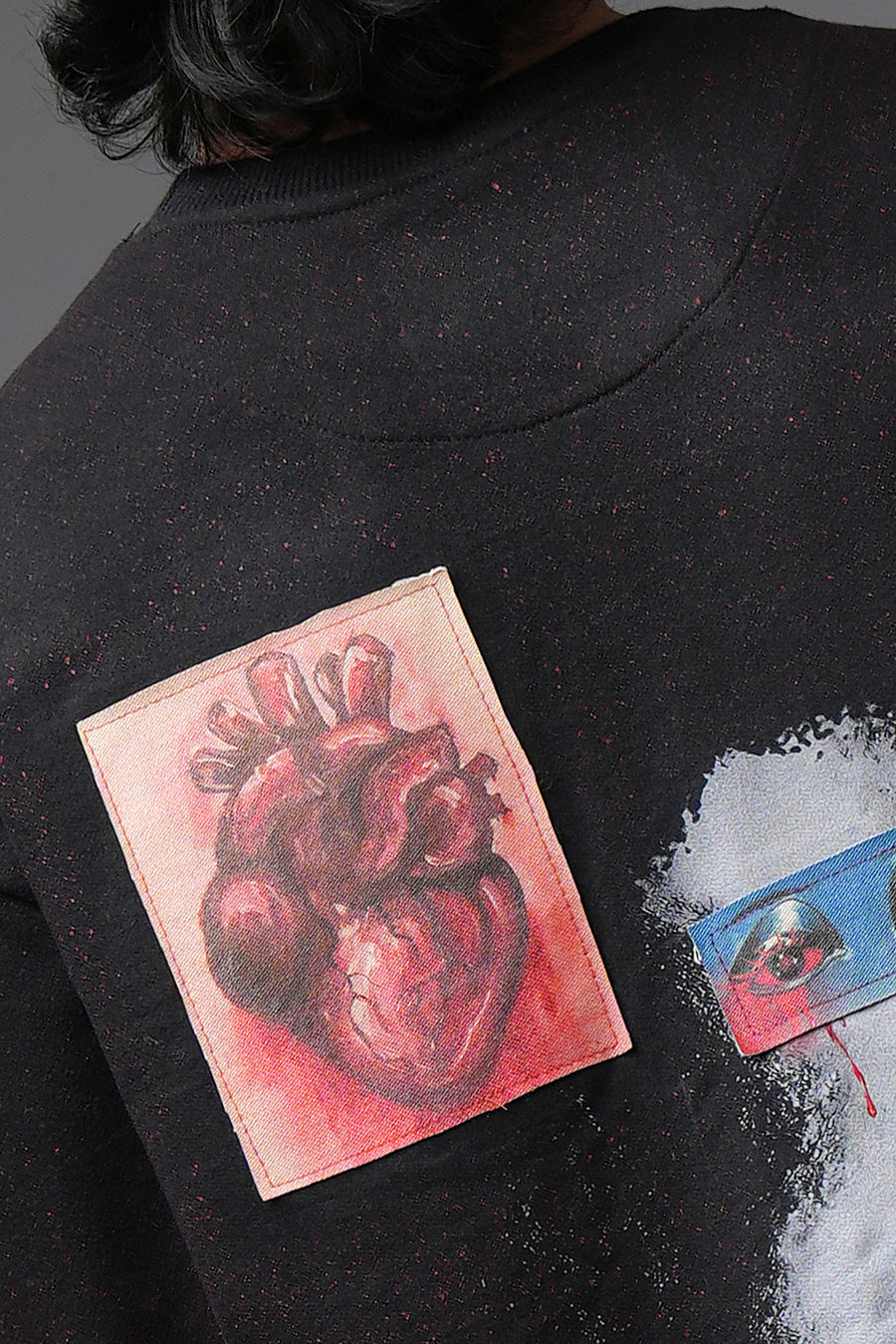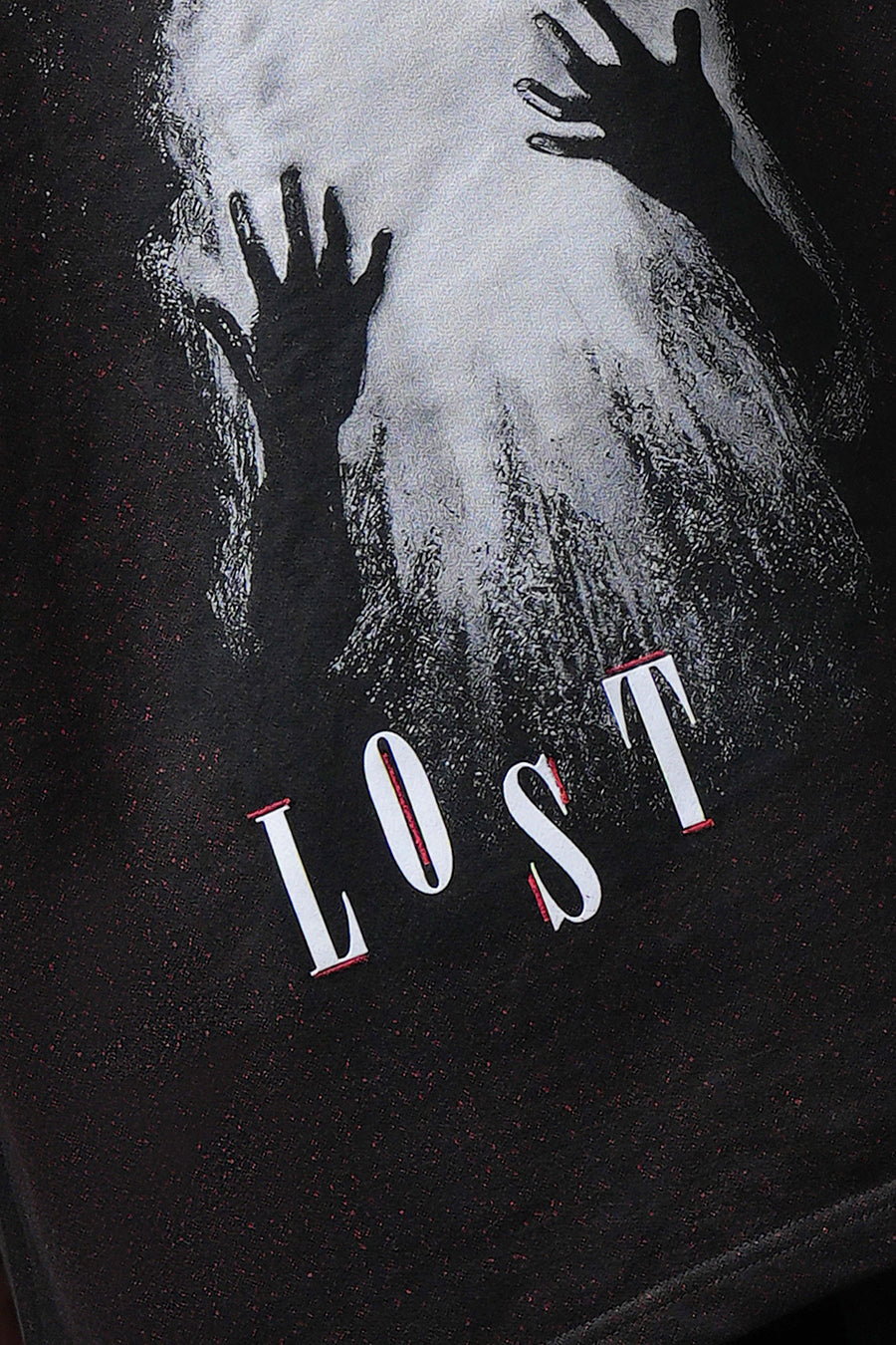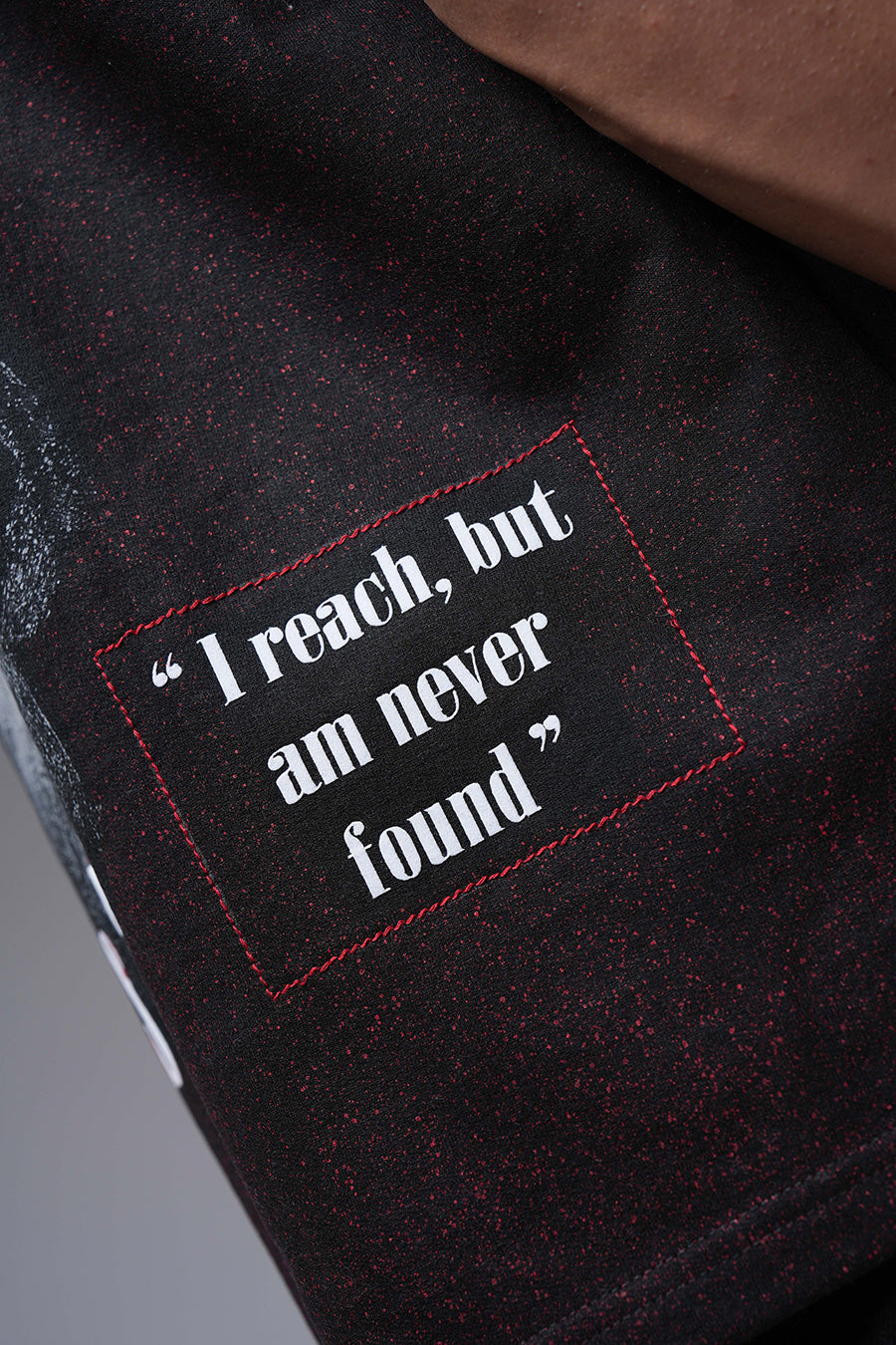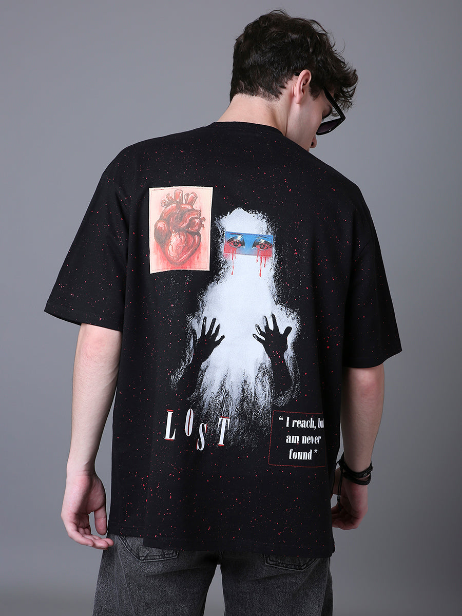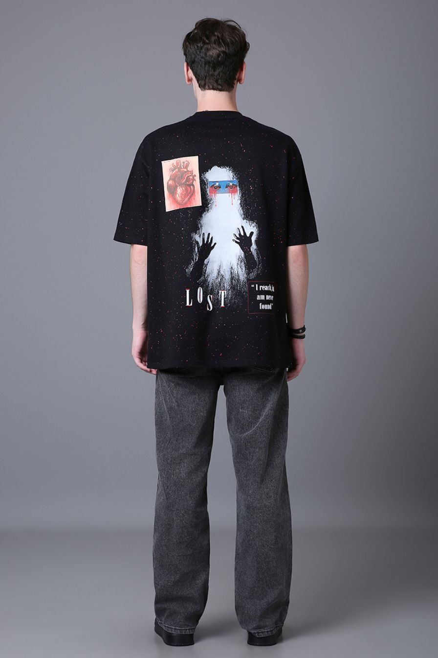 The Fallen Through Tee evokes a sense of haunting vulnerability. A ghostly, obscured figure with pixelated eyes dominates the black canvas, suggesting a loss of identity or a descent into the unknown. A detached heart graphic adds a raw, emotional element. The fragmented text, "Lost" and a quote, further the theme of disorientation. This tee captures a sense of being adrift, of falling through the cracks of reality. Its dark palette and unsettling imagery create a powerful, introspective statement.