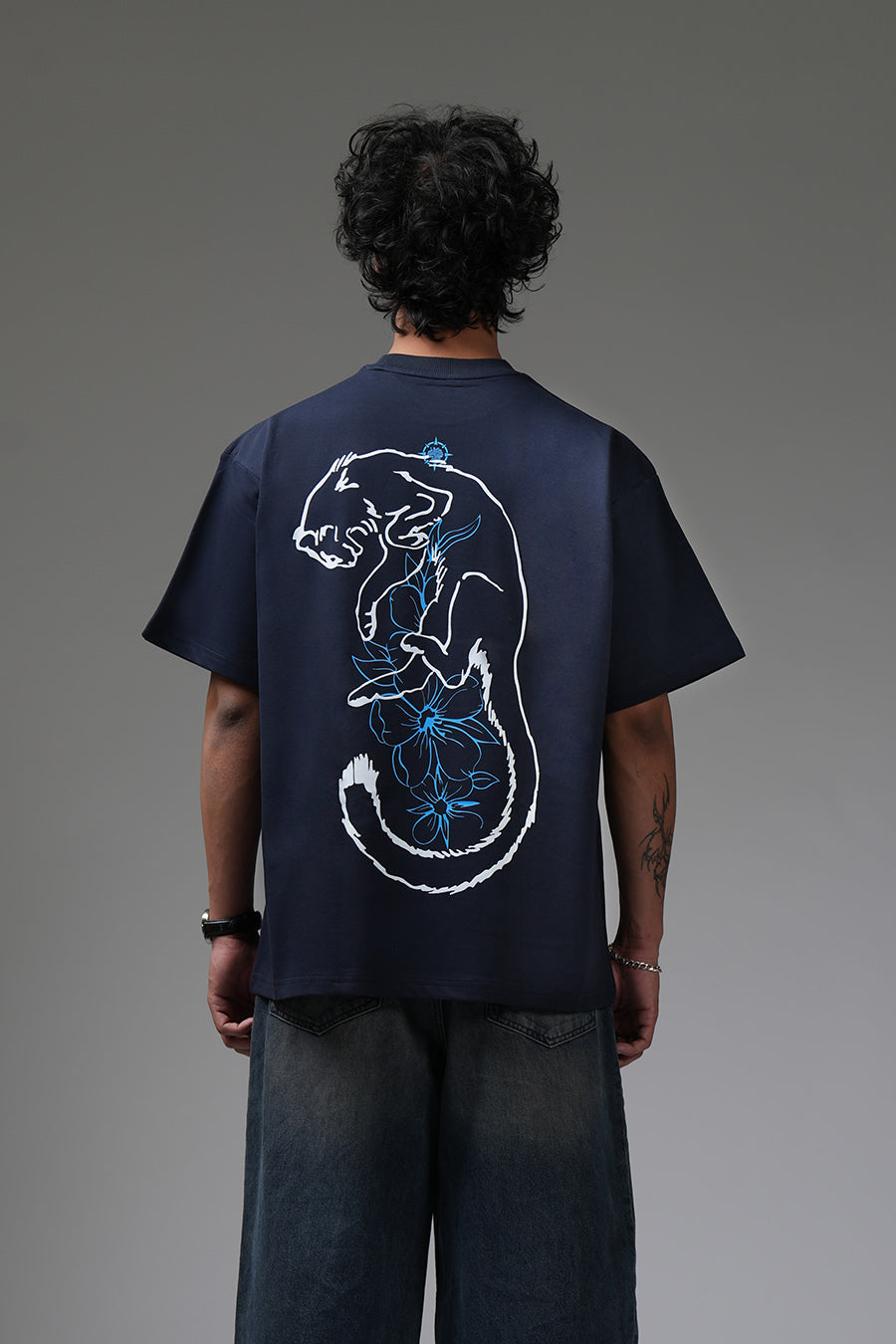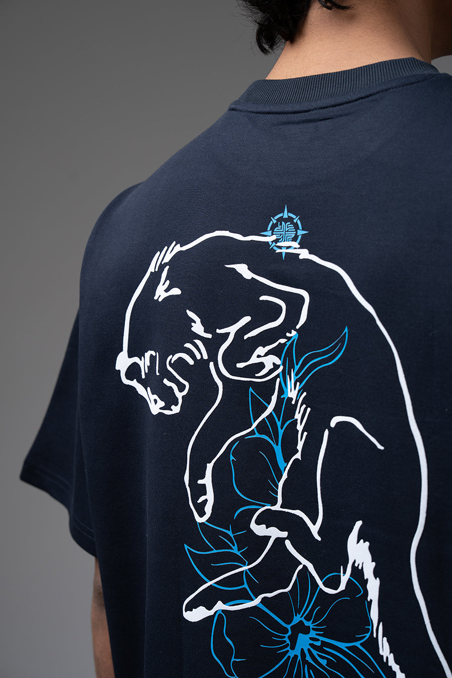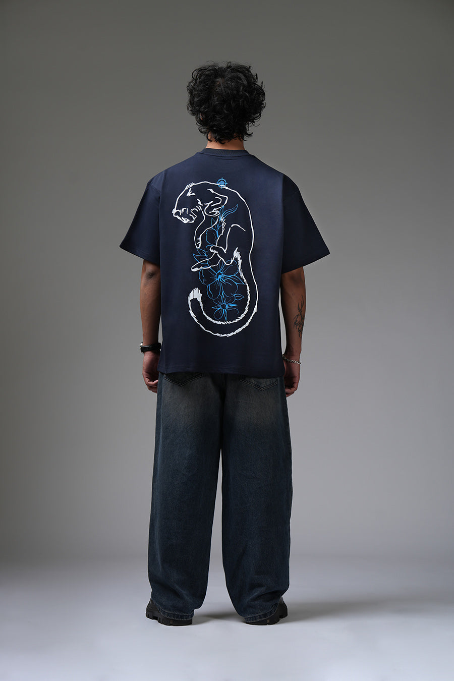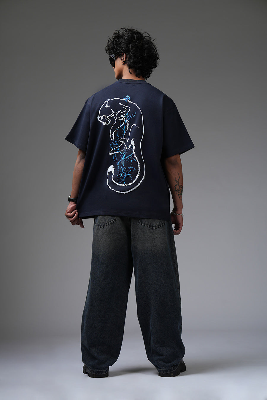 The Feral Direction Tee evokes a blend of wild elegance and enigmatic guidance. A stylized, white-lined panther, poised in a dynamic pose, dominates the dark fabric. Delicate blue floral accents add a touch of contrast and mystery. This design suggests a journey guided by instinct and untamed spirit. The oversized fit enhances the sense of freedom and movement. It's a wearable statement of following one's primal urges, with a hint of ethereal beauty.