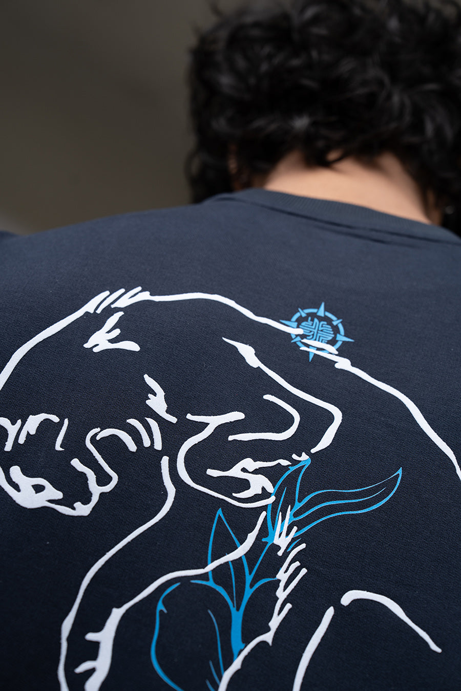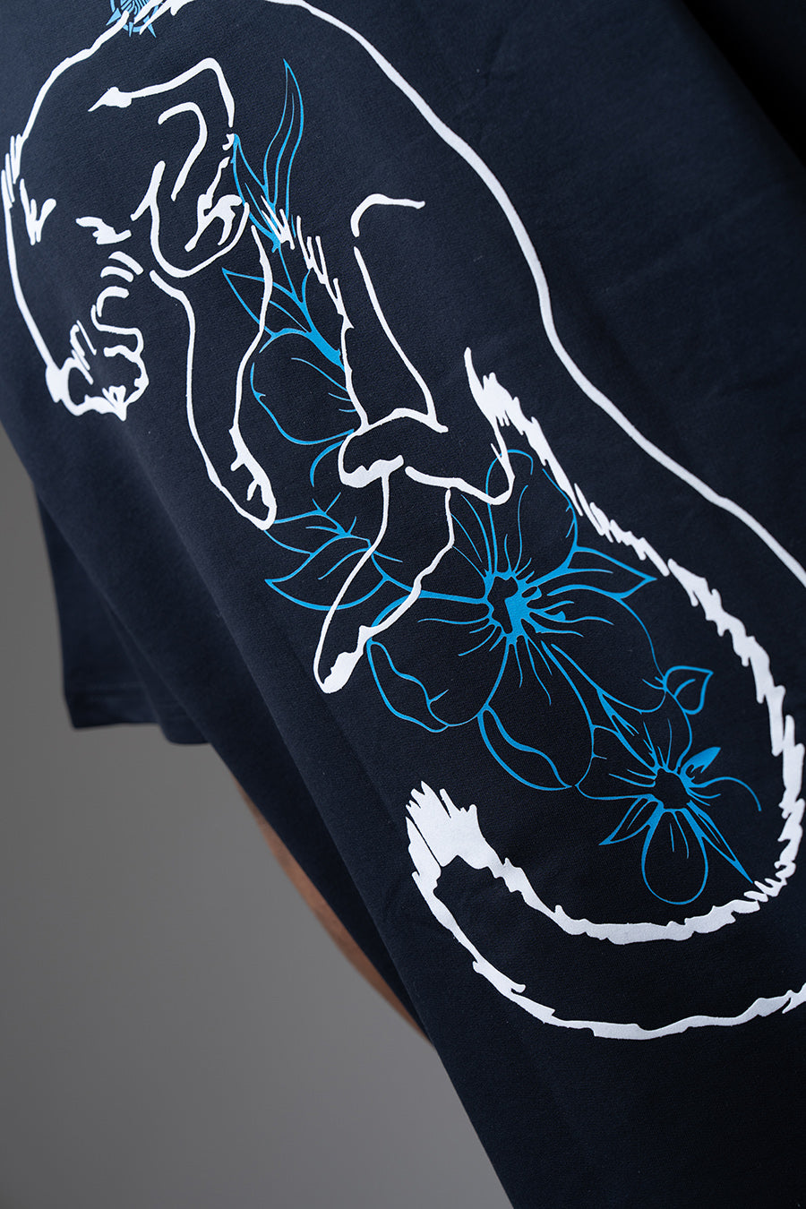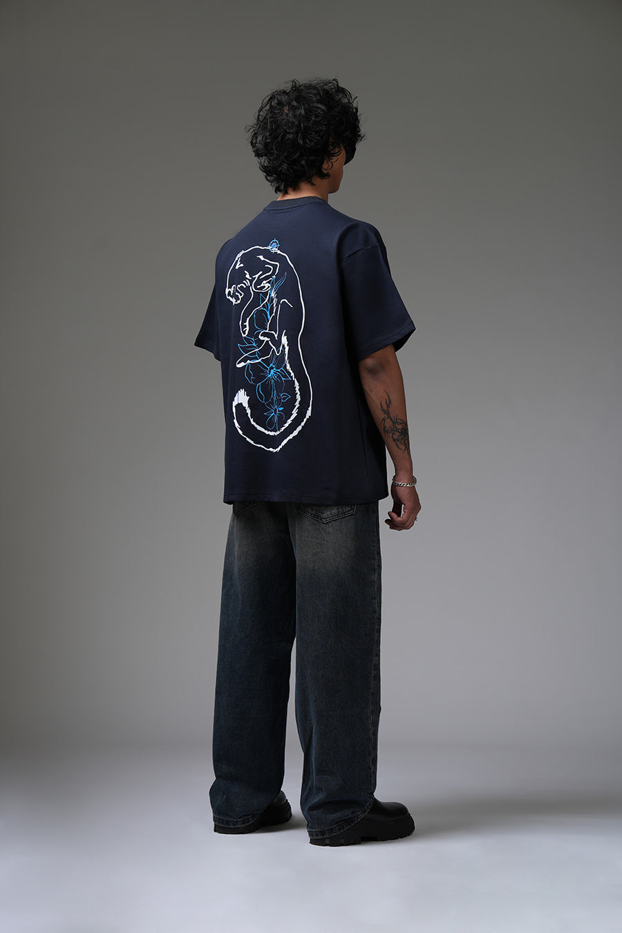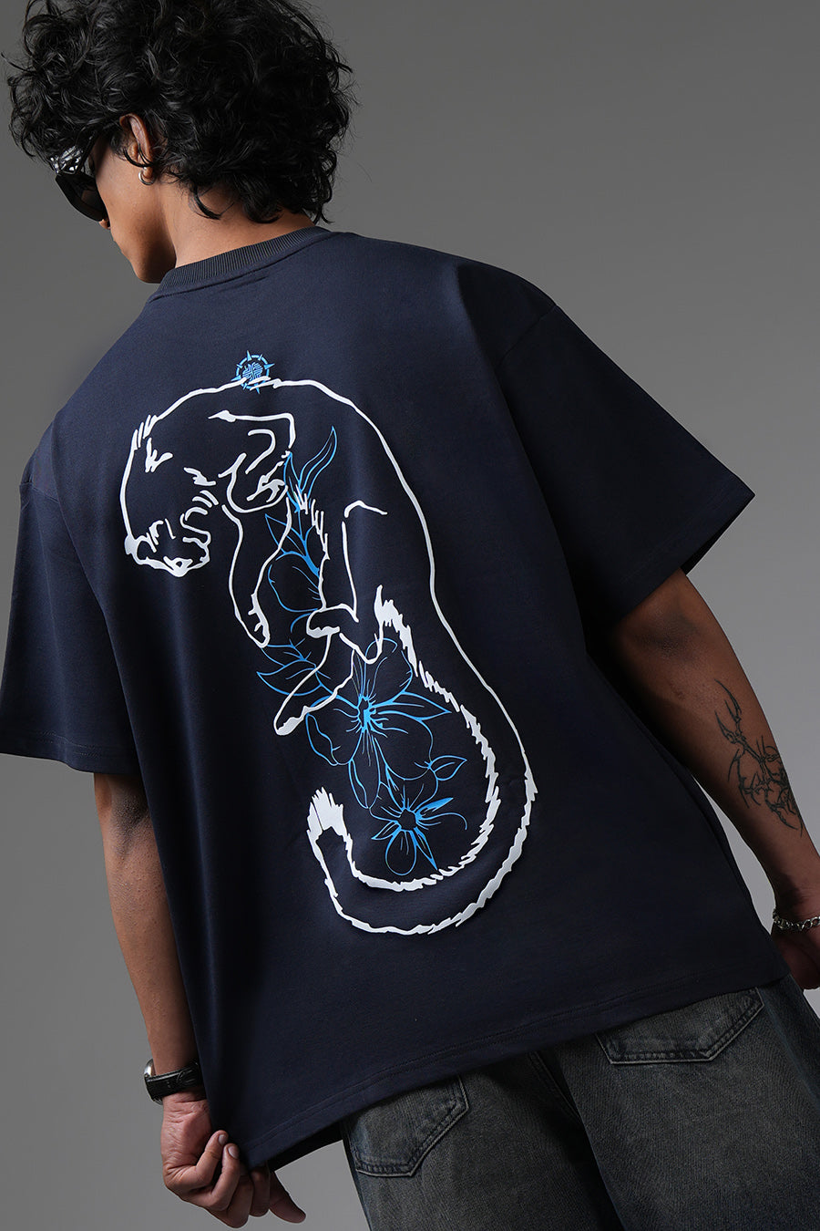 The Feral Direction Tee evokes a blend of wild elegance and enigmatic guidance. A stylized, white-lined panther, poised in a dynamic pose, dominates the dark fabric. Delicate blue floral accents add a touch of contrast and mystery. This design suggests a journey guided by instinct and untamed spirit. The oversized fit enhances the sense of freedom and movement. It's a wearable statement of following one's primal urges, with a hint of ethereal beauty.