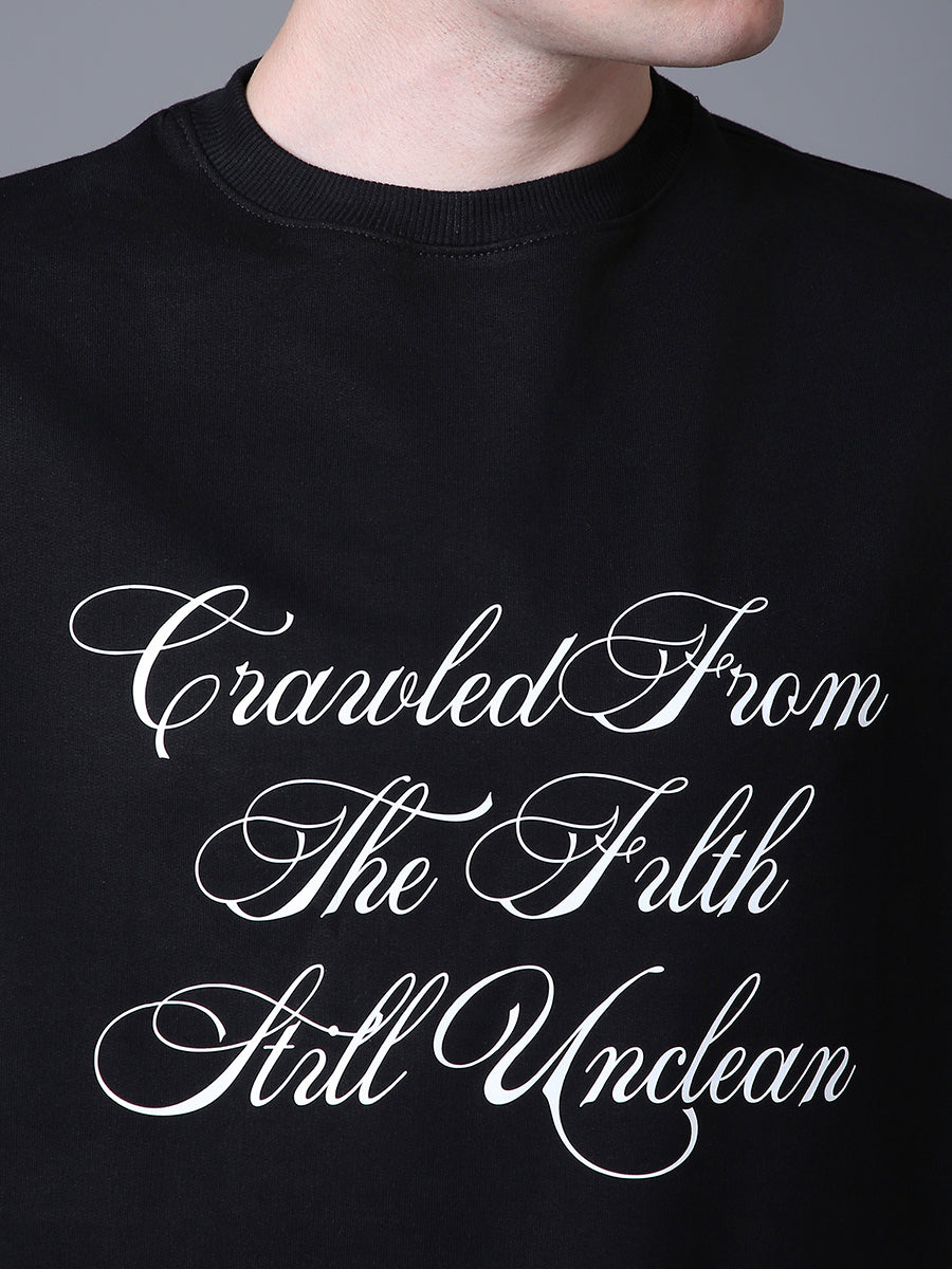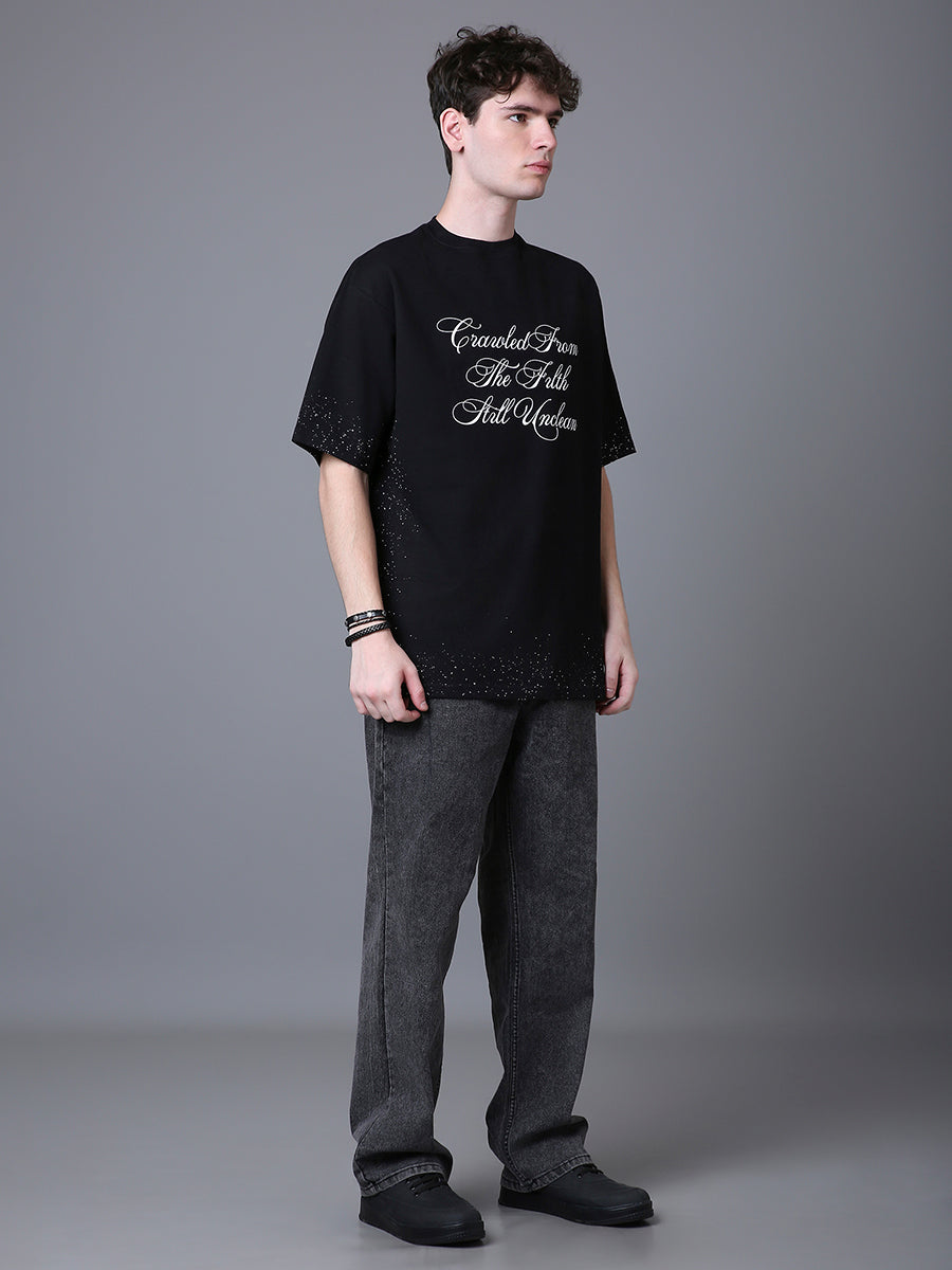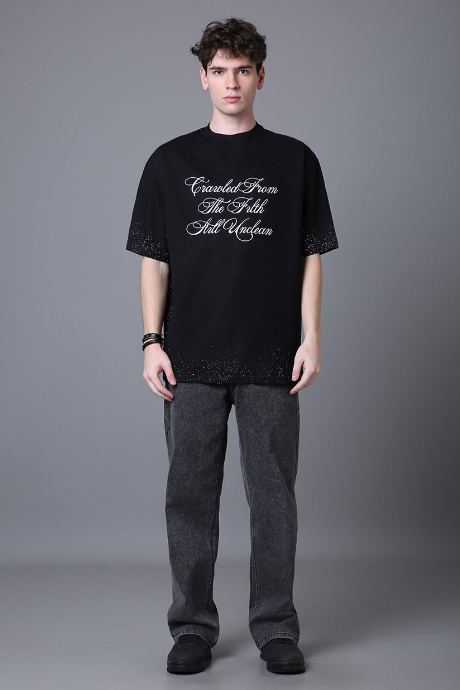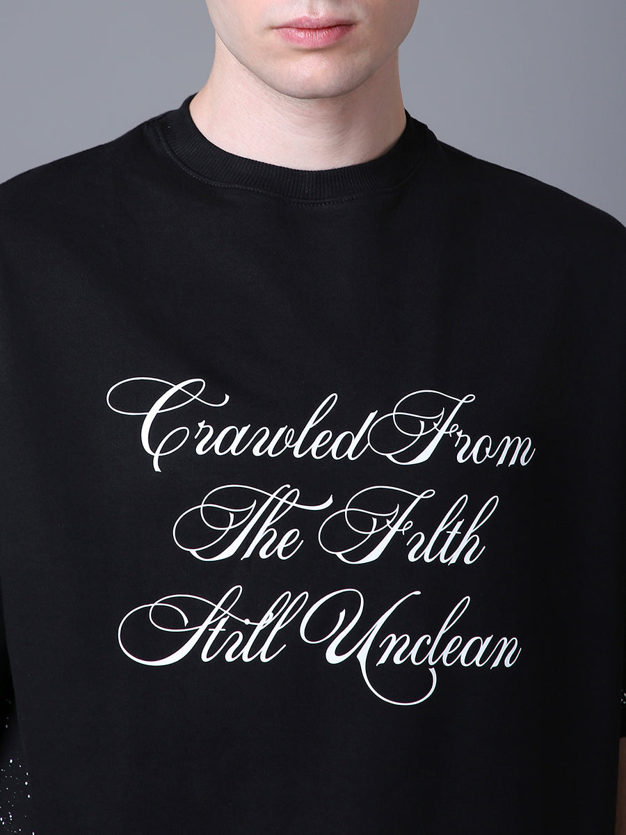 The Gutter Saint Tee presents a juxtaposition of grit and grace. Elegant script reading "Travelled Through The Filth Still Unclean" is emblazoned on a distressed black canvas, suggesting a narrative of redemption or flawed nobility. The contrast between the refined font and the rough texture creates a sense of tension and complexity. This tee evokes a sense of urban poetry and the beauty found in imperfection. It's a wearable statement of resilience and unconventional elegance.