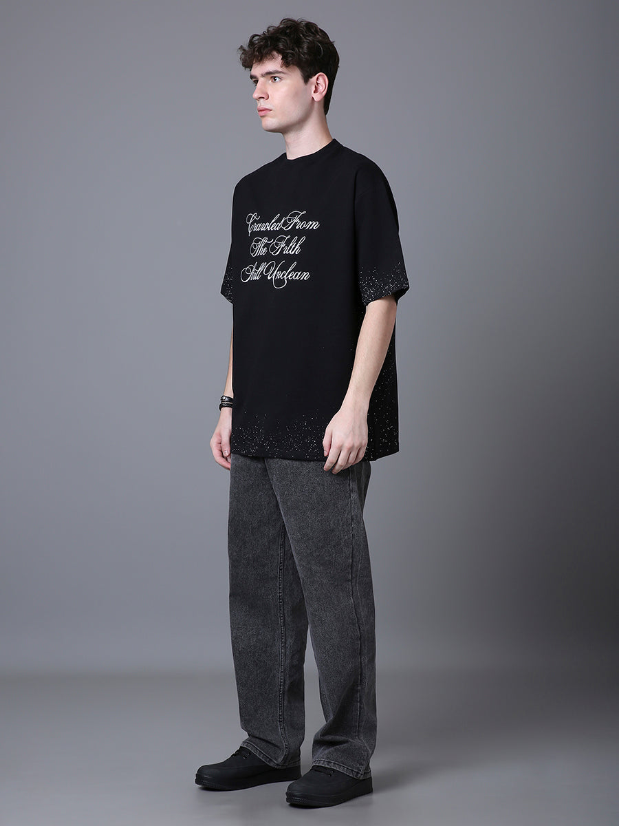 This tee, crafted from heavyweight 250+ GSM cotton, blends comfort with a thought-provoking, narrative-driven design. The roomy, oversized cut and classic round neckline offer a casual yet impactful silhouette. The soft, durable 100% cotton twill material features standard media printing, along with Spray Paint Printing, creating a fun textured effect. Ideal for making a unique statement or layering with ease.