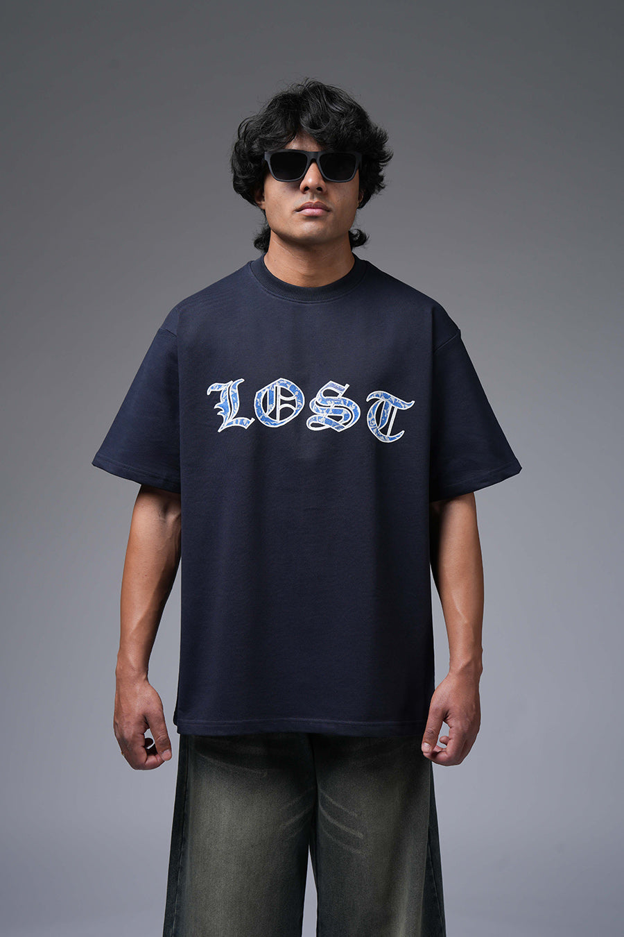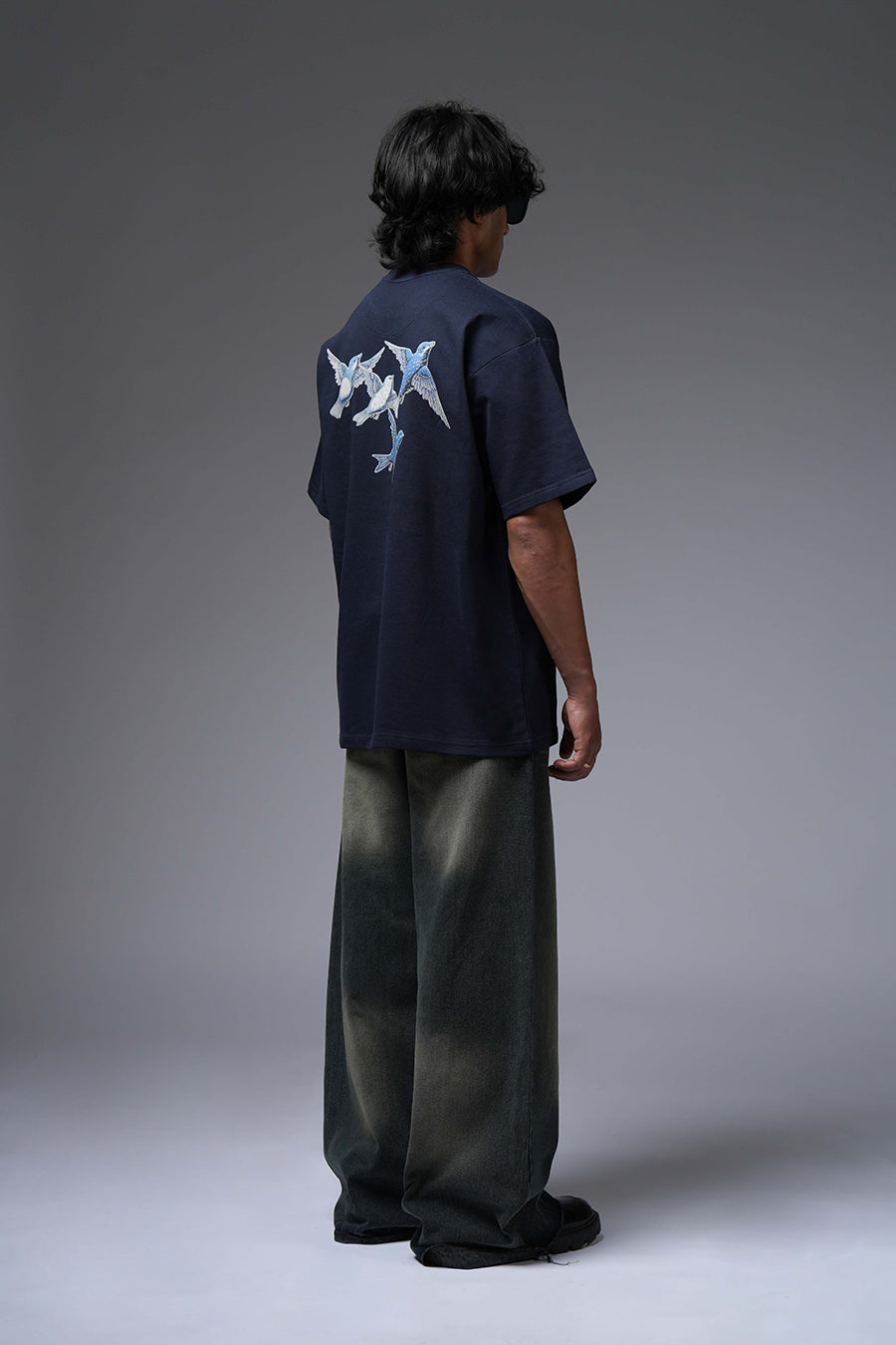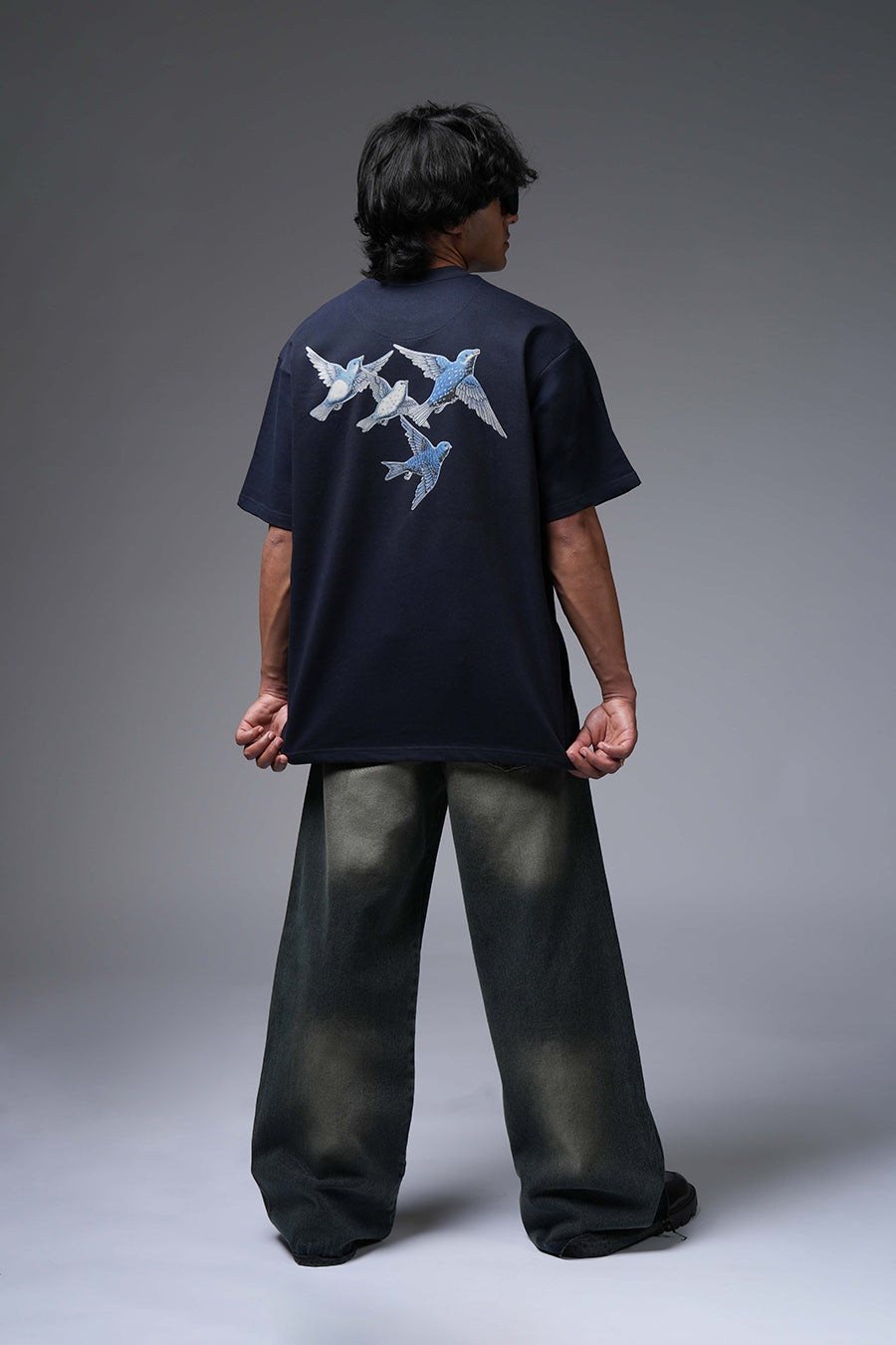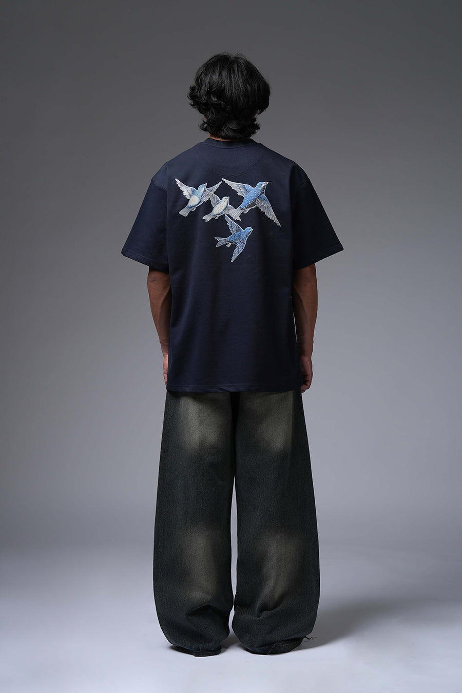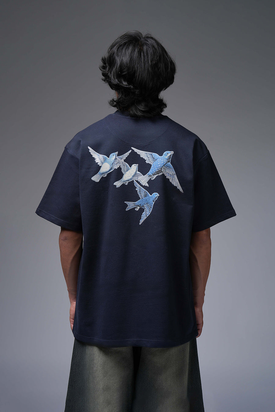 The Lost Flight Tee captures a sense of poignant beauty and yearning. A flock of blue and white birds, rendered in a detailed, almost ethereal style, graces the dark navy canvas. This design suggests a journey interrupted or a longing for freedom. The birds' direction implies a departure or a search for something lost. Its oversized fit enhances the sense of melancholy and introspection. It's a wearable piece that speaks to themes of hope, loss, and the desire to soar.