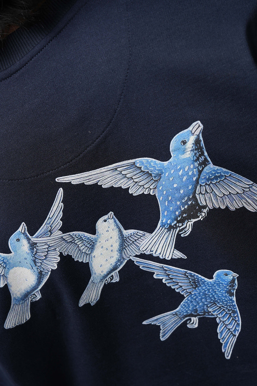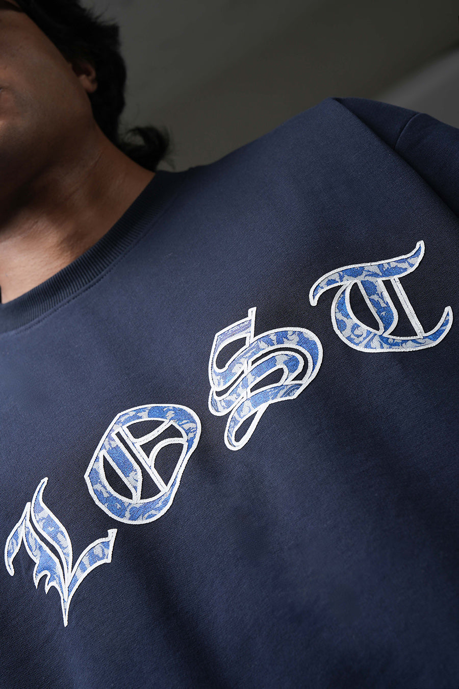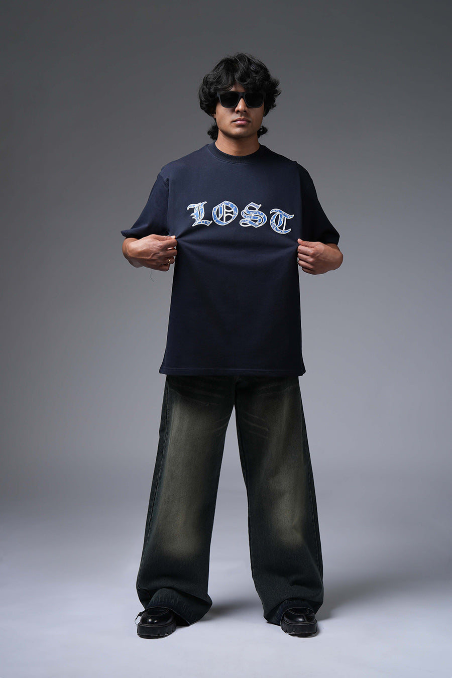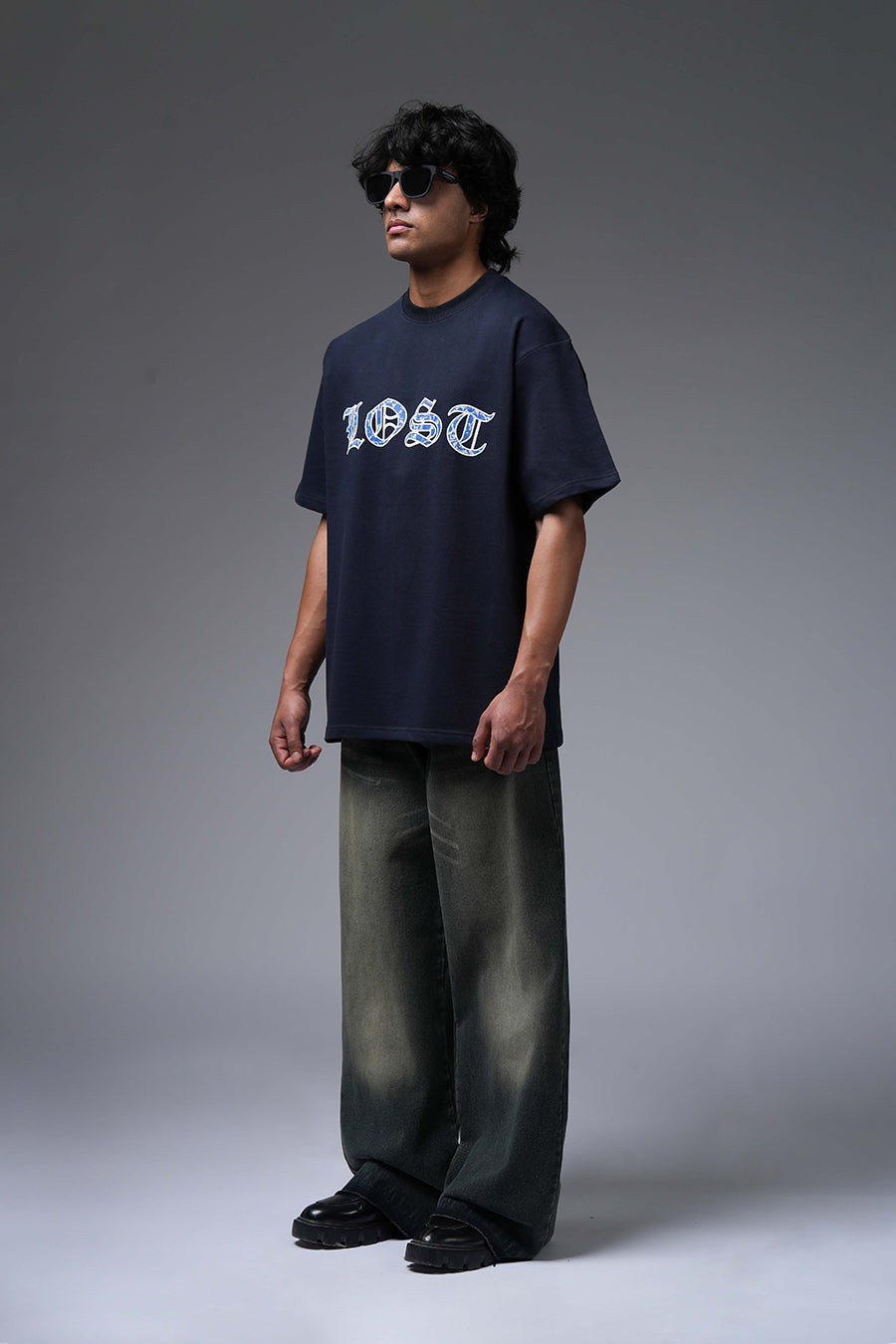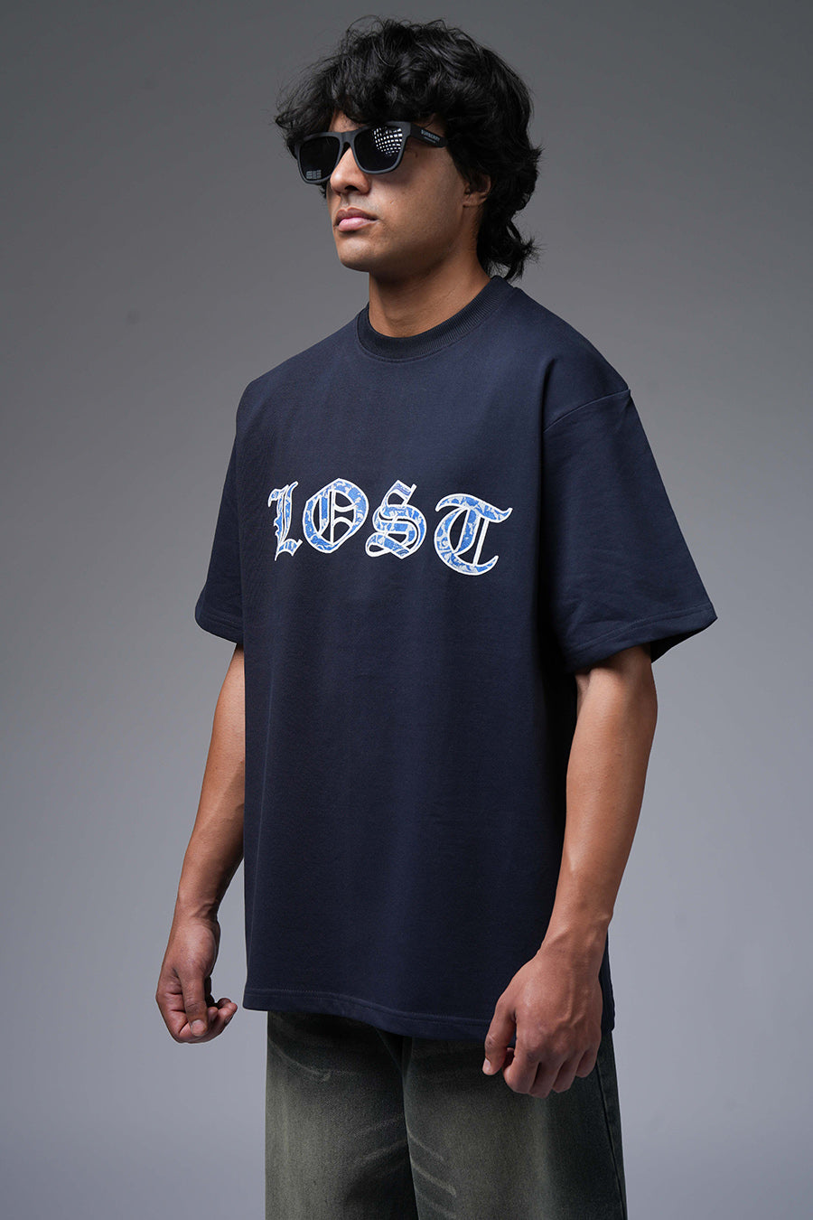 The Lost Flight Tee captures a sense of poignant beauty and yearning. A flock of blue and white birds, rendered in a detailed, almost ethereal style, graces the dark navy canvas. This design suggests a journey interrupted or a longing for freedom. The birds' direction implies a departure or a search for something lost. Its oversized fit enhances the sense of melancholy and introspection. It's a wearable piece that speaks to themes of hope, loss, and the desire to soar.