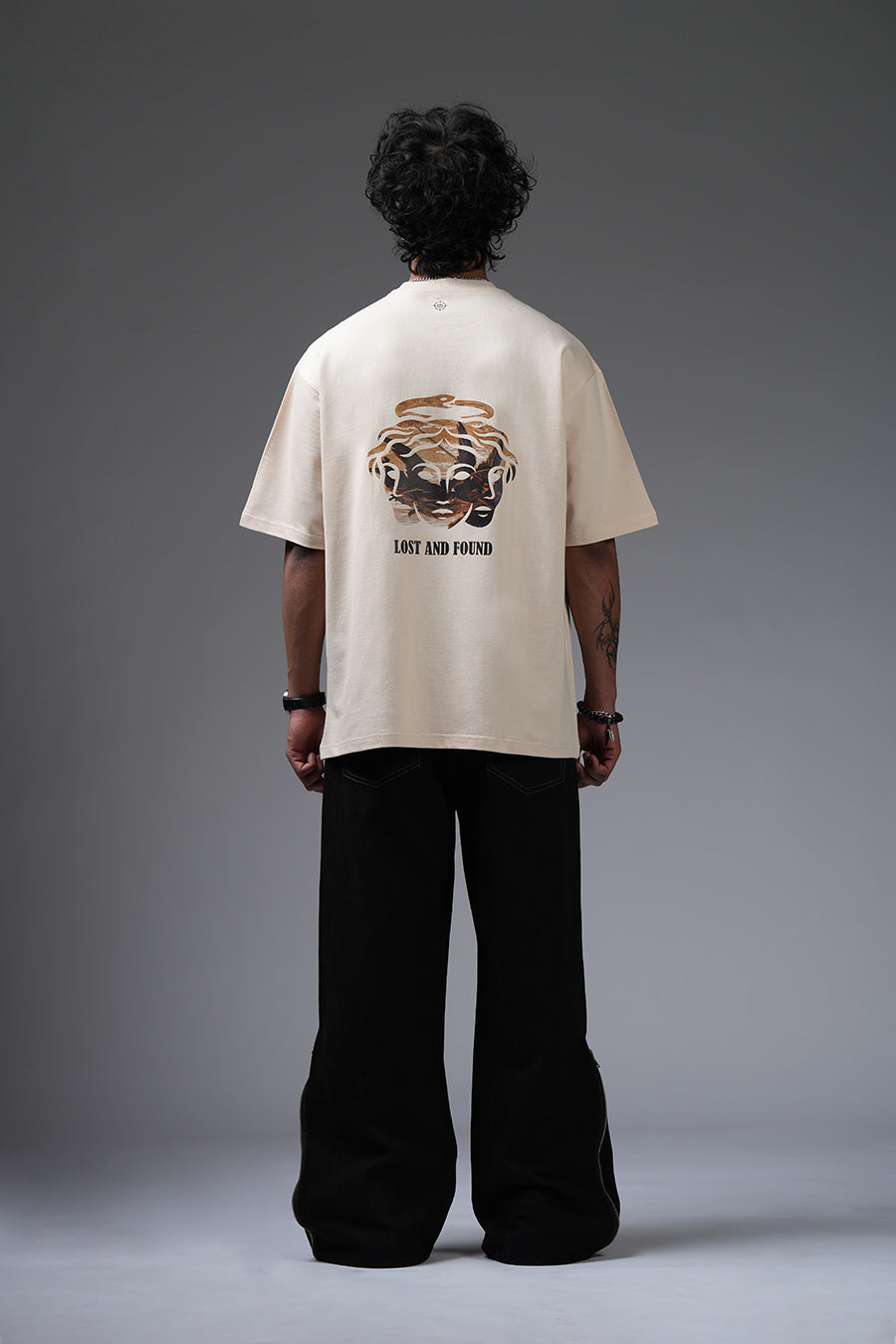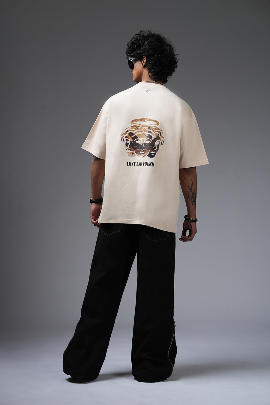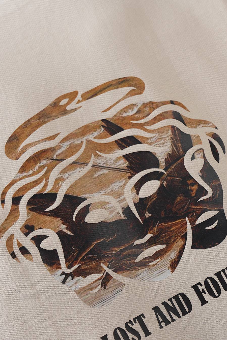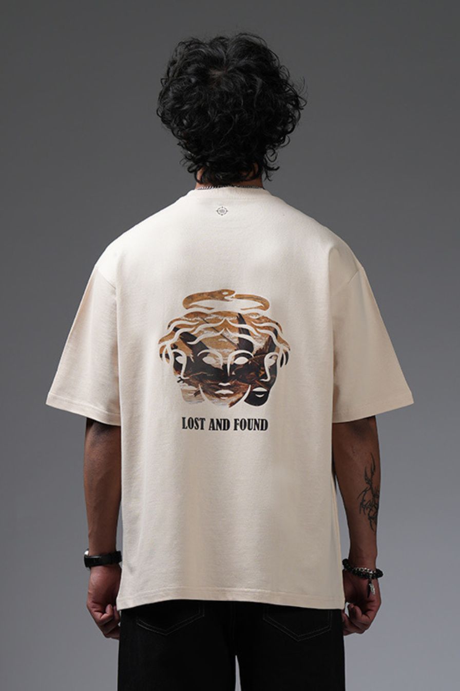 The Lost Gods Tee presents a fusion of ancient and modern aesthetics. A stylized, fragmented face, reminiscent of classical sculpture, adorns the back against a neutral backdrop. The "Lost and Found" inscription adds a contemporary, thematic layer. This design suggests a commentary on the erosion or rediscovery of cultural narratives. The oversized fit enhances the sense of timelessness and artistic expression. It's a wearable piece that bridges historical artistry with modern streetwear sensibilities.