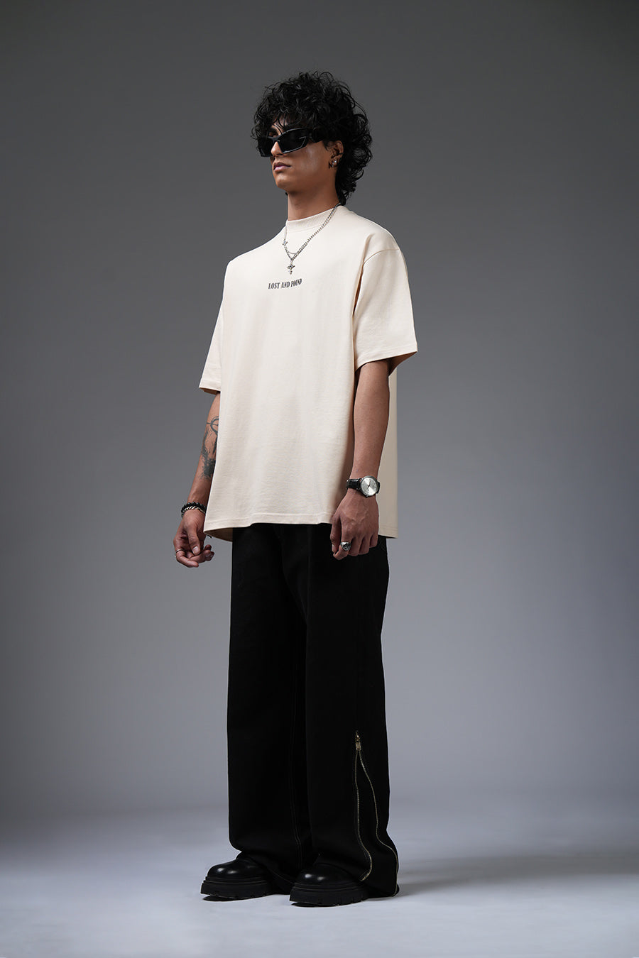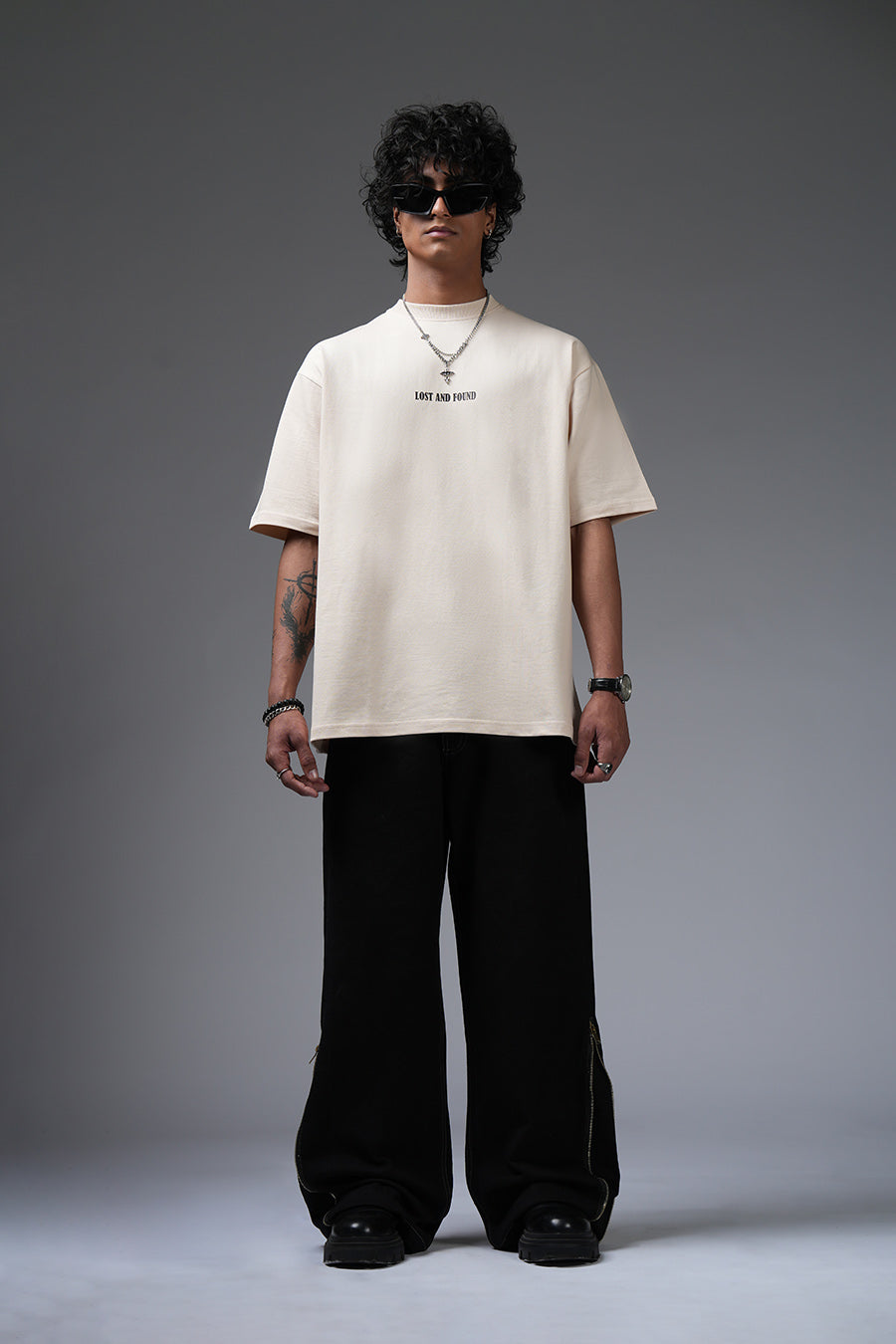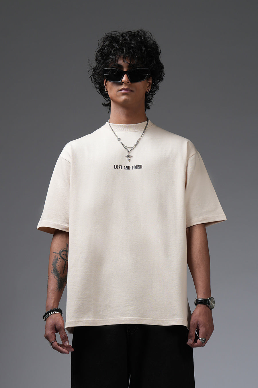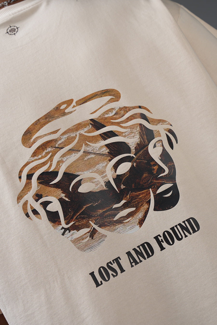 The Lost Gods Tee presents a fusion of ancient and modern aesthetics. A stylized, fragmented face, reminiscent of classical sculpture, adorns the back against a neutral backdrop. The "Lost and Found" inscription adds a contemporary, thematic layer. This design suggests a commentary on the erosion or rediscovery of cultural narratives. The oversized fit enhances the sense of timelessness and artistic expression. It's a wearable piece that bridges historical artistry with modern streetwear sensibilities.