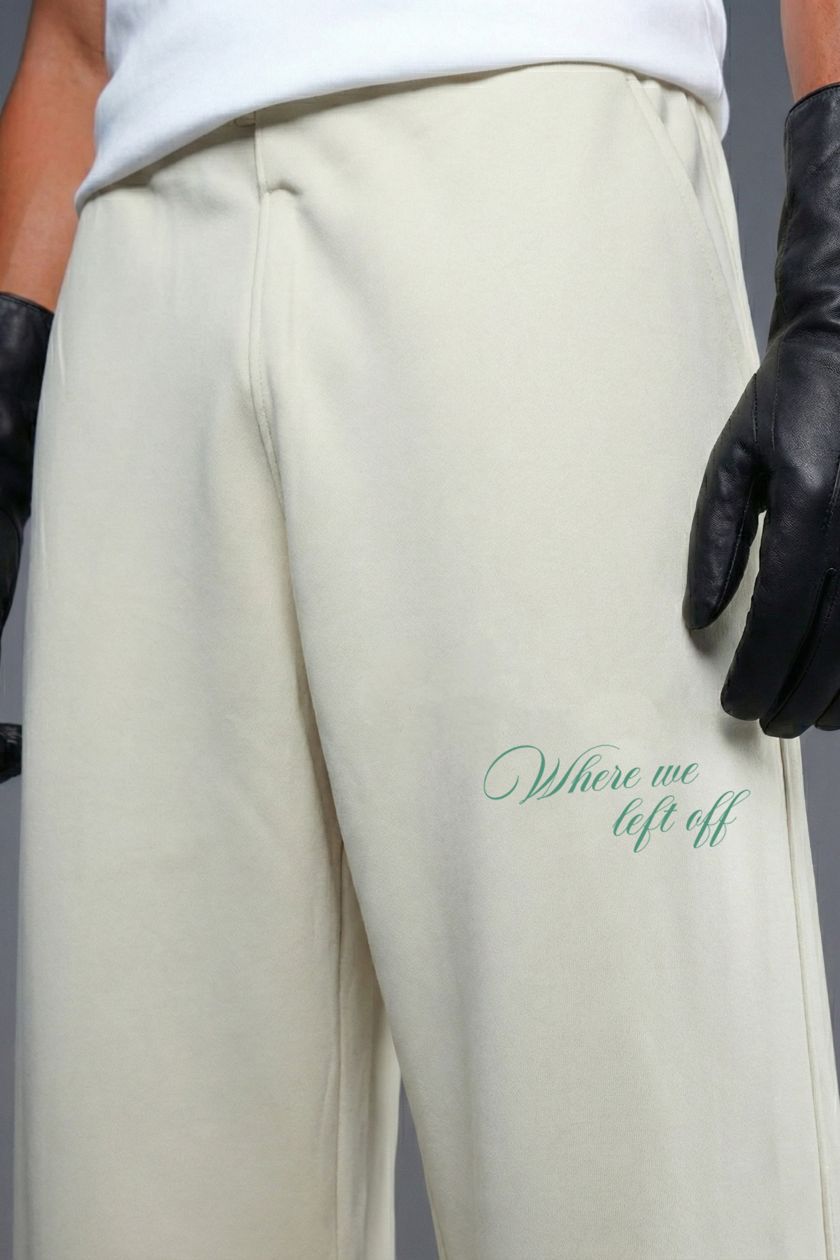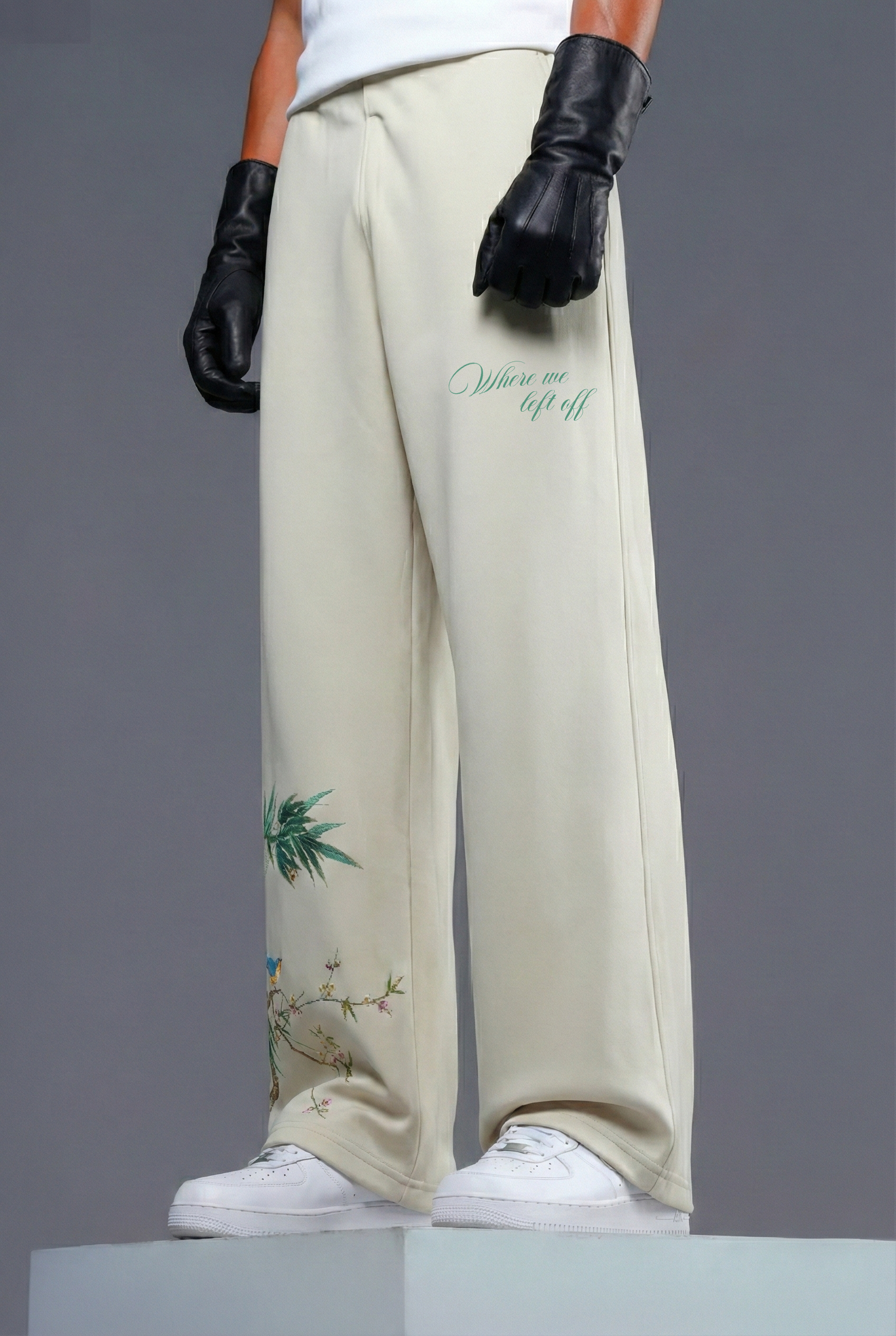 Heavyweight beige wide-leg sweatpants with a bluebird and floral artwork printed down the leg, inspired by hand-painted botanical designs. Near the pocket, “Where we left off” sits in a clean script for a subtle personal touch. Made from thick cotton fleece with a relaxed fit that falls straight and stays comfortable all day. Soft feel, structured look, and sharp DTG/DTF print detailing.