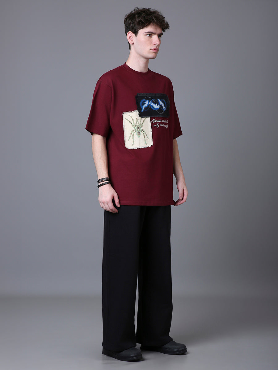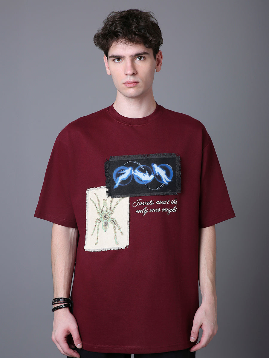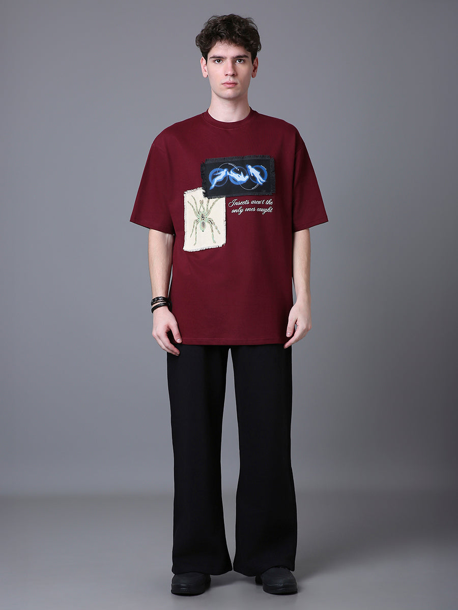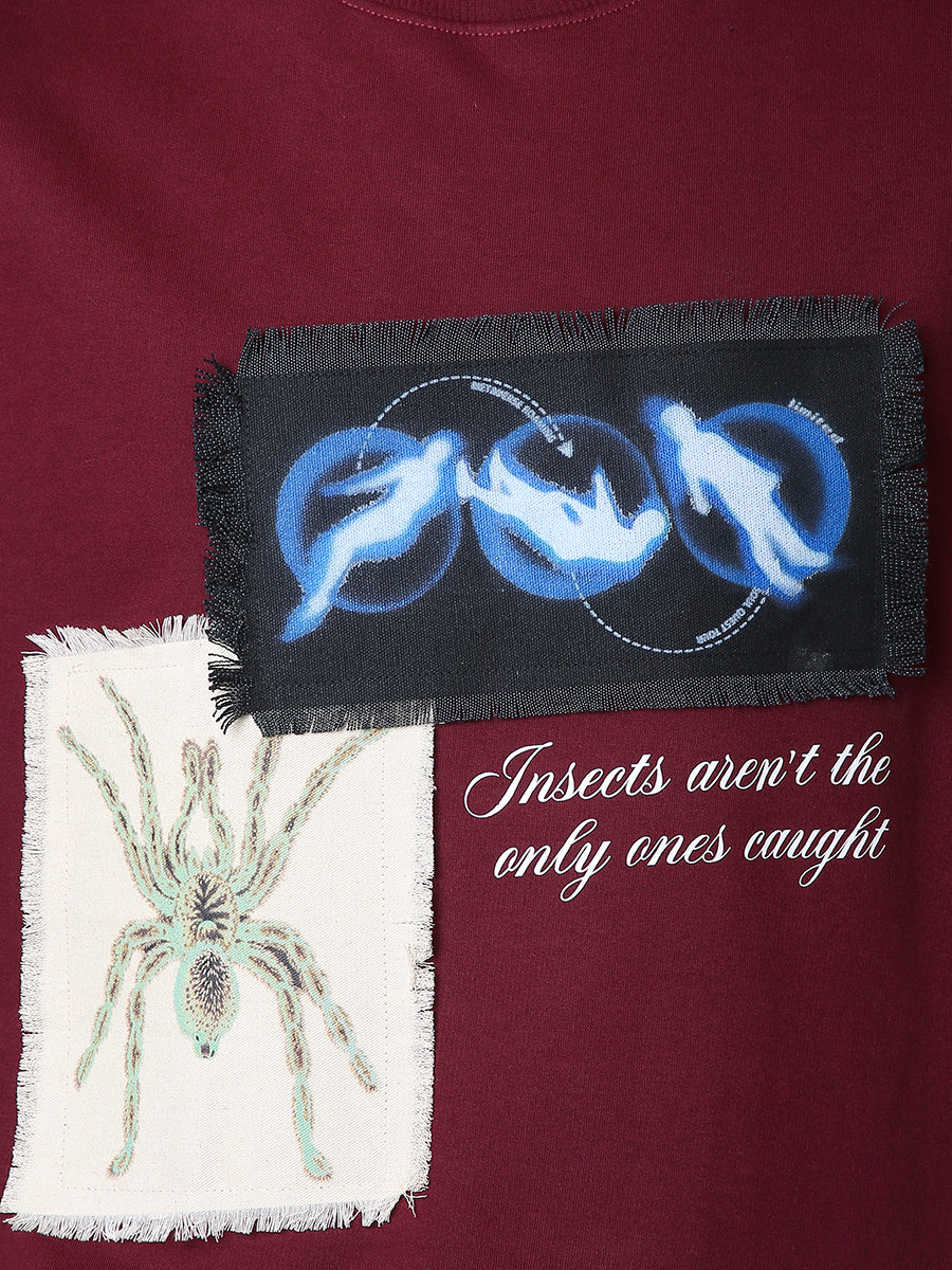The “Something Crawled Back” Tee explores themes of entrapment and return, weaving together imagery of webs, shadows, and what lurks beneath the surface. On the front, layered patch-style graphics feature a haunting tarantula and the words “Insects aren’t the only ones caught,” blurring the line between predator and prey.