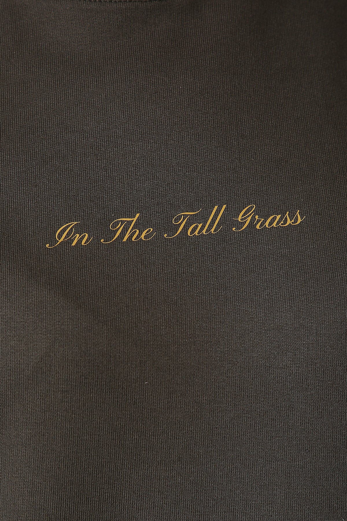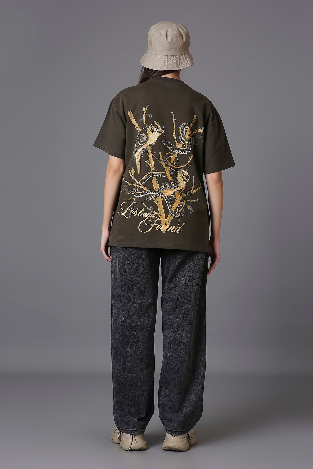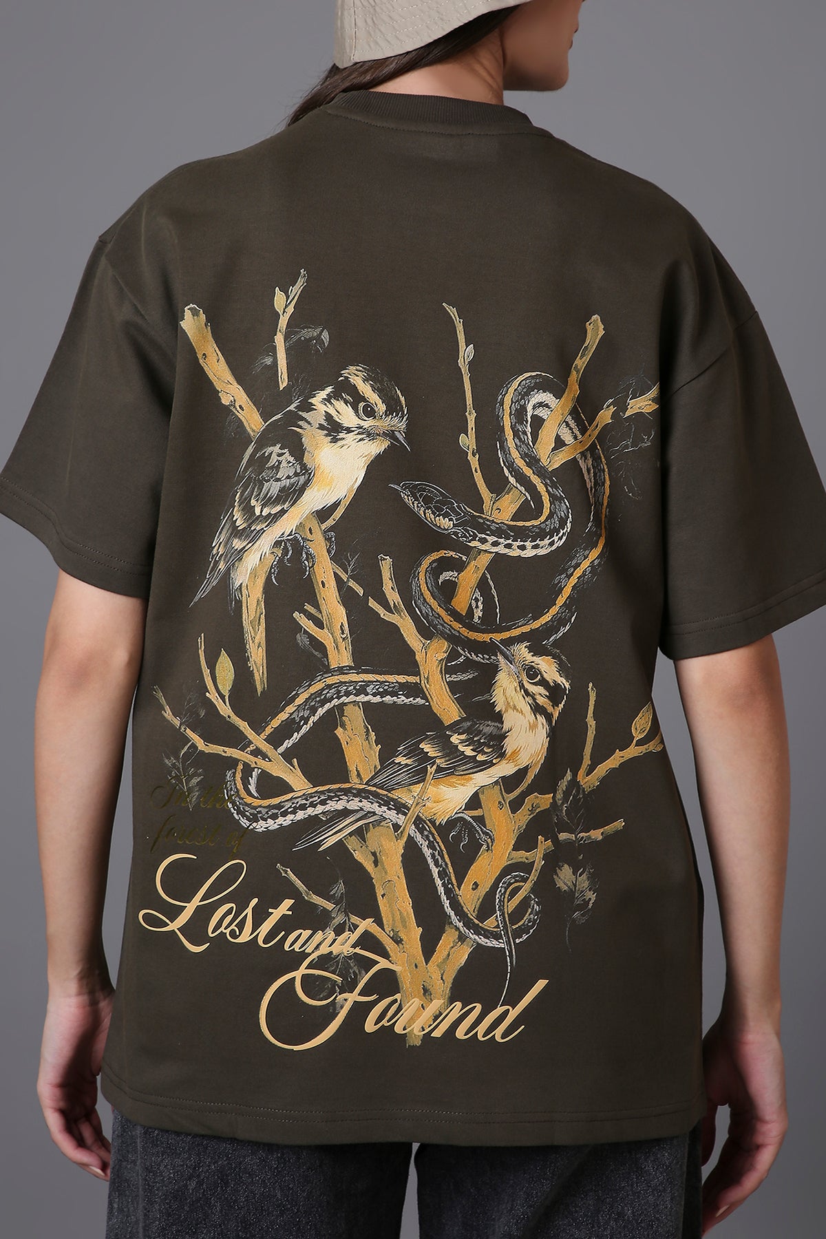 The Tangled Fate Tee depicts a scene of intertwined natural elements, suggesting a narrative of destiny and interconnectedness. A bird and a snake, rendered in warm, earthy tones, are entangled in branches against an olive green backdrop. The "Lost and Found" script adds a layer of mystery and symbolic meaning. This tee evokes a sense of wild beauty and the unpredictable nature of fate. Its detailed illustration and organic colour palette create a visually compelling, almost allegorical piece.