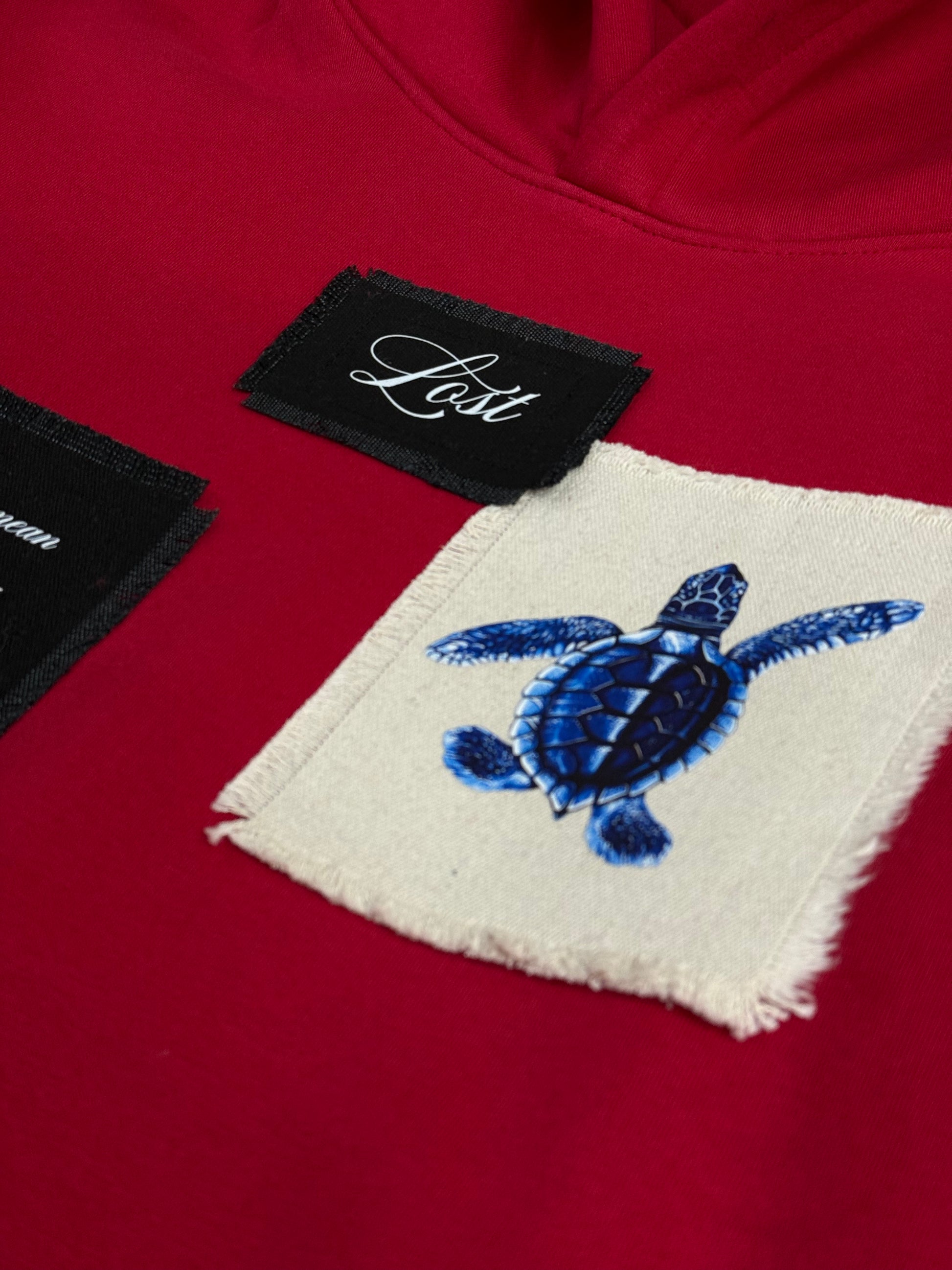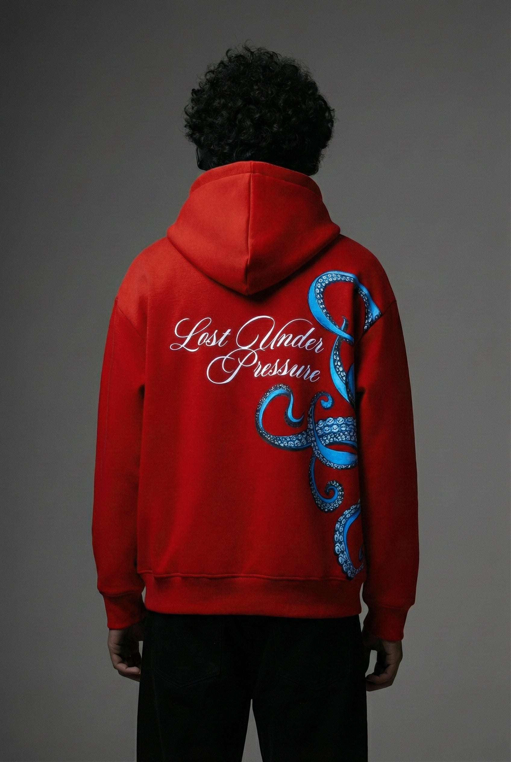 Heavyweight red hoodie with a bold octopus tentacles graphic printed using DTG for smooth color and sharp detail. Made from thick 400 GSM fleece that stays warm, structured, and comfortable. Loose, relaxed fit for easy everyday wear.